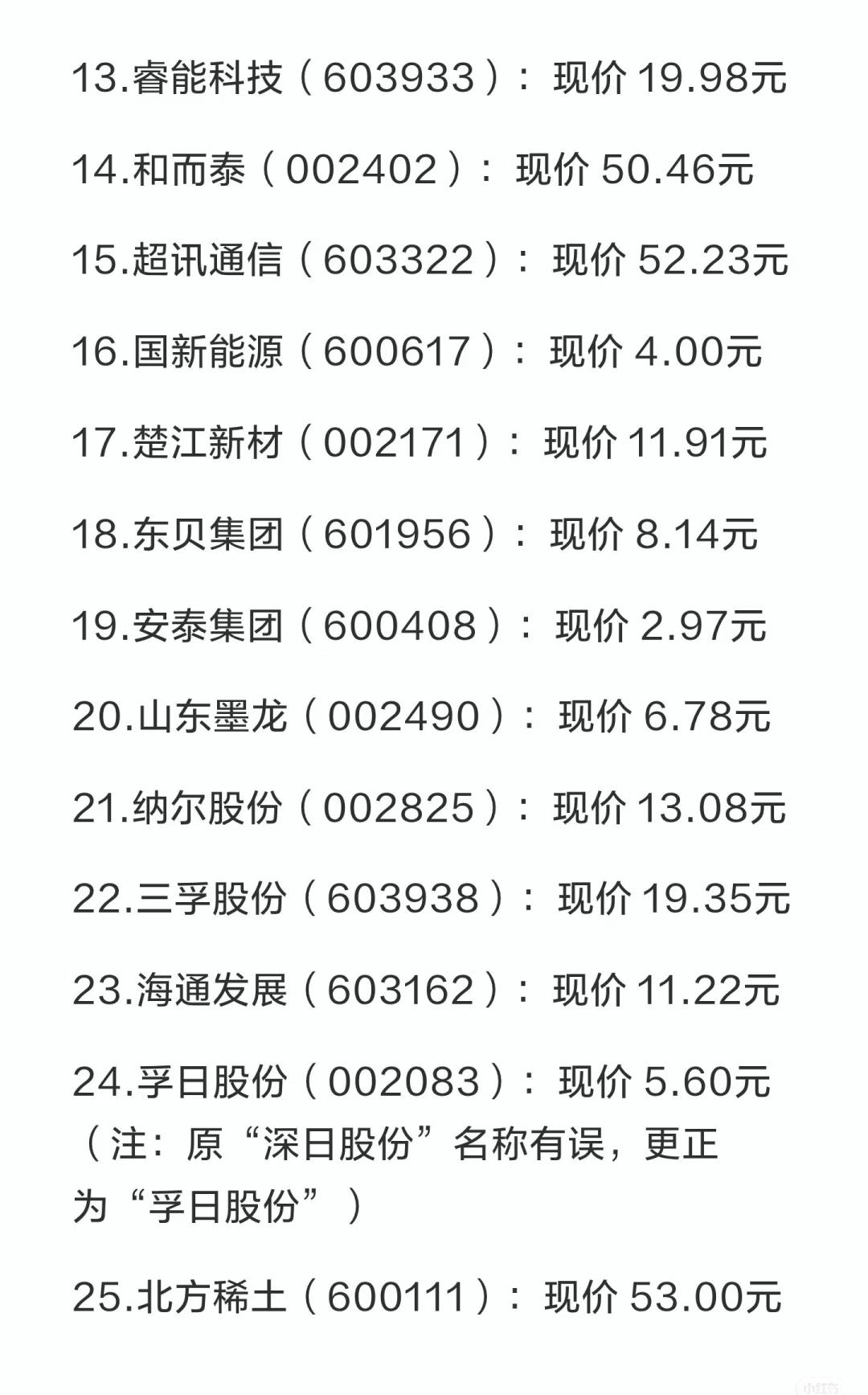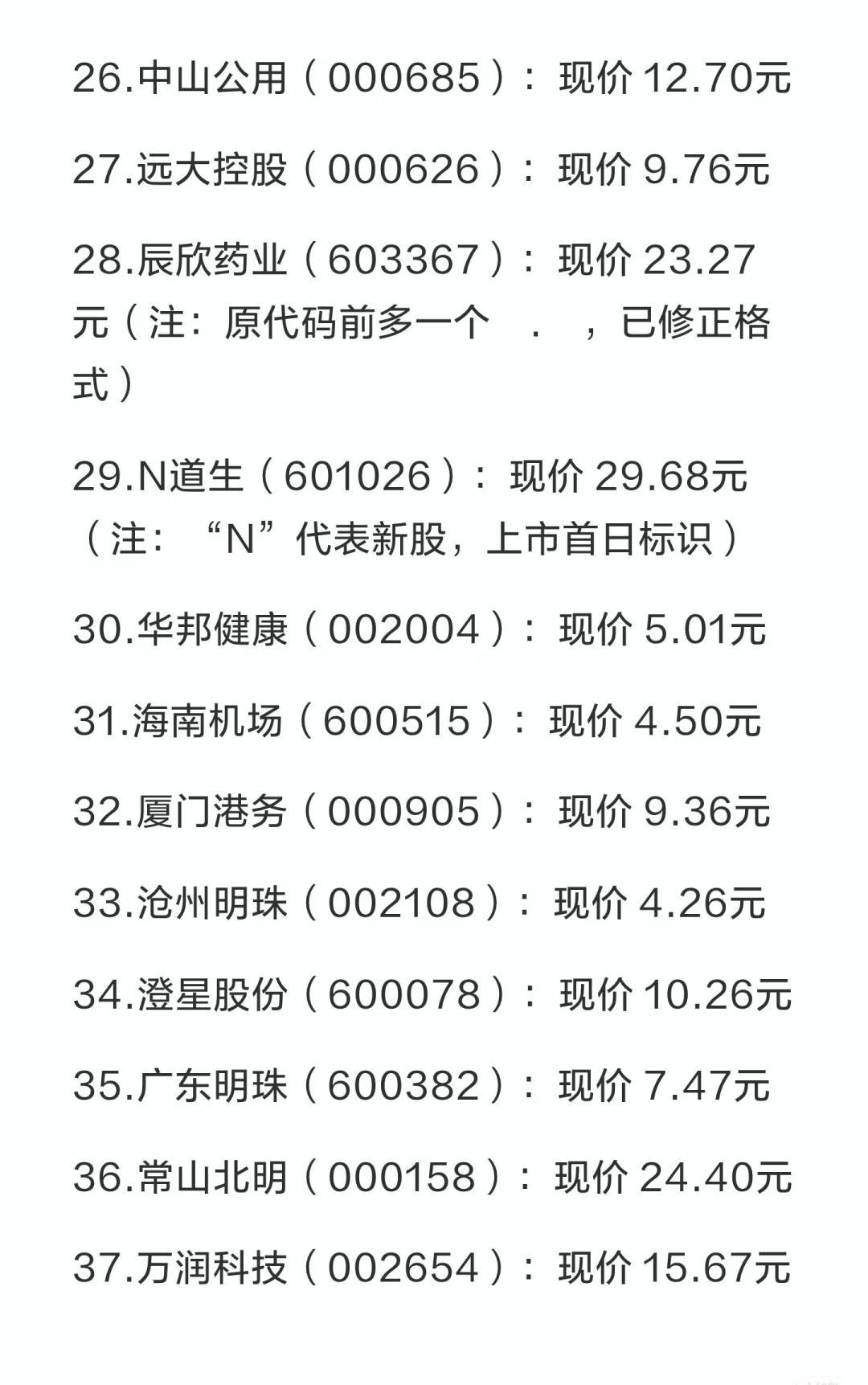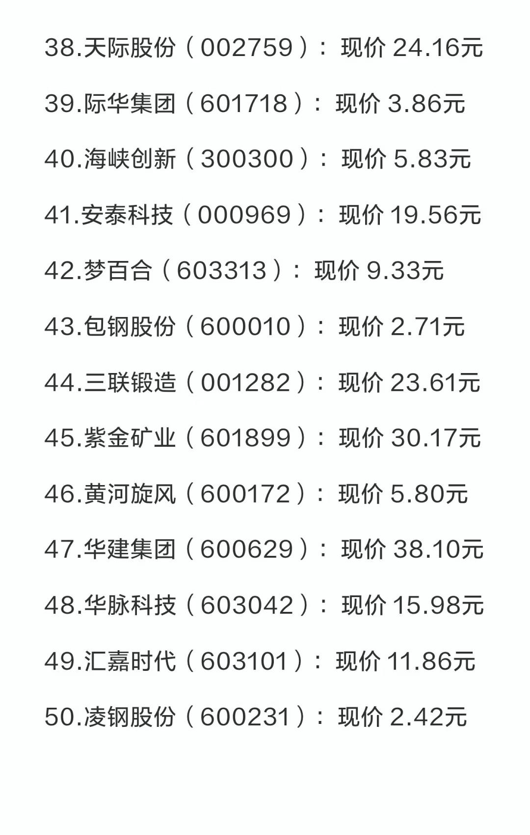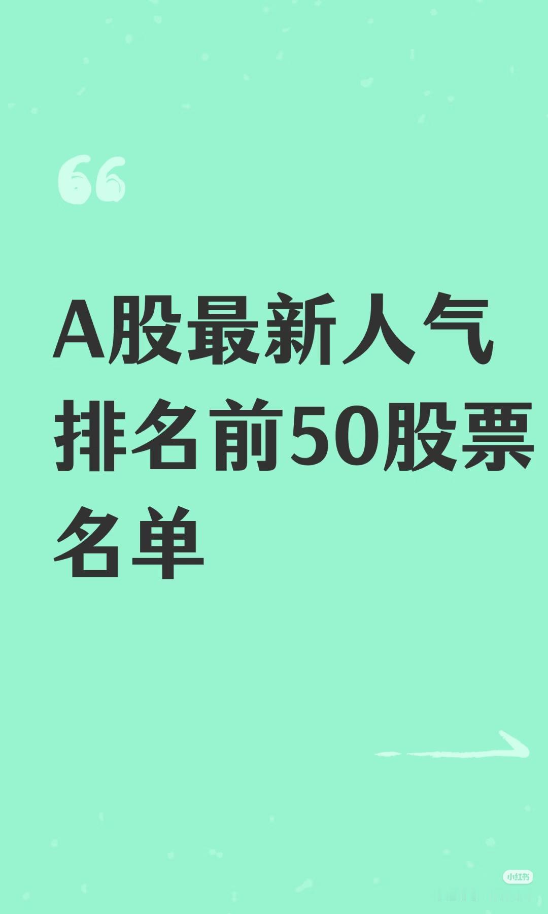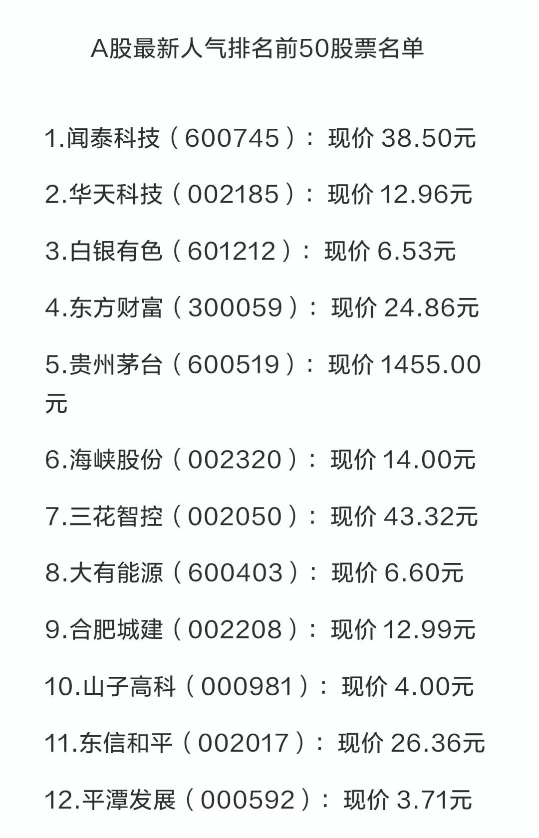 “A 股最新人气排名前 50 股票名单”: 1. 闻泰科技(600745):现价 38.50 元 2. 华天科技(002185):现价 12.96 元 3. 白银有色(601212):现价 6.53 元 4. 东方财富(300059):现价 24.86 元 5. 贵州茅台(600519):现价 1455.00 元 6. 海峡股份(002320):现价 14.00 元 7. 三花智控(002050):现价 43.32 元 8. 大有能源(600403):现价 6.60 元 9. 合肥城建(002208):现价 12.99 元 10. 山子高科(000981):现价 4.00 元 11. 东信和平(002017):现价 26.36 元 12. 平潭发展(000592):现价 3.71 元 13. 睿能科技(603933):现价 19.98 元 14. 和而泰(002402):现价 50.46 元 15. 超讯通信(603322):现价 52.23 元 16. 国新能源(600617):现价 4.00 元 17. 楚江新材(002171):现价 11.91 元 18. 东贝集团(601956):现价 8.14 元 19. 安泰集团(600408):现价 2.97 元 20. 山东墨龙(002490):现价 6.78 元 21. 纳尔股份(002825):现价 13.08 元 22. 三孚股份(603938):现价 19.35 元 23. 海通发展(603162):现价 11.22 元 24. 孚日股份(002083):现价 5.60 25. 北方稀土(600111):现价 53.00 元 26. 中山公用(000685):现价 12.70 元 27. 远大控股(000626):现价 9.76 元 28. 辰欣药业(603367):现价 23.27 元(注:原代码前多一个“.”,已修正格式) 29. N 道生(601026):现价 29.68 元(注:“N”代表新股,上市首日标识) 30. 华邦健康(002004):现价 5.01 元 31. 海南机场(600515):现价 4.50 元 32. 厦门港务(000905):现价 9.36 元 33. 沧州明珠(002108):现价 4.26 元 34. 澄星股份(600078):现价 10.26 元 35. 广东明珠(600382):现价 7.47 元 36. 常山北明(000158):现价 24.40 元 37. 万润科技(002654):现价 15.67 元 38. 天际股份(002759):现价 24.16 元 39. 际华集团(601718):现价 3.86 元 40. 海峡创新(300300):现价 5.83 元 41. 安泰科技(000969):现价 19.56 元 42. 梦百合(603313):现价 9.33 元 43. 包钢股份(600010):现价 2.71 元 44. 三联锻造(001282):现价 23.61 元 45. 紫金矿业(601899):现价 30.17 元 46. 黄河旋风(600172):现价 5.80 元 47. 华建集团(600629):现价 38.10 元 48. 华脉科技(603042):现价 15.98 元 49. 汇嘉时代(603101):现价 11.86 元 50. 凌钢股份(600231):现价 2.42 元