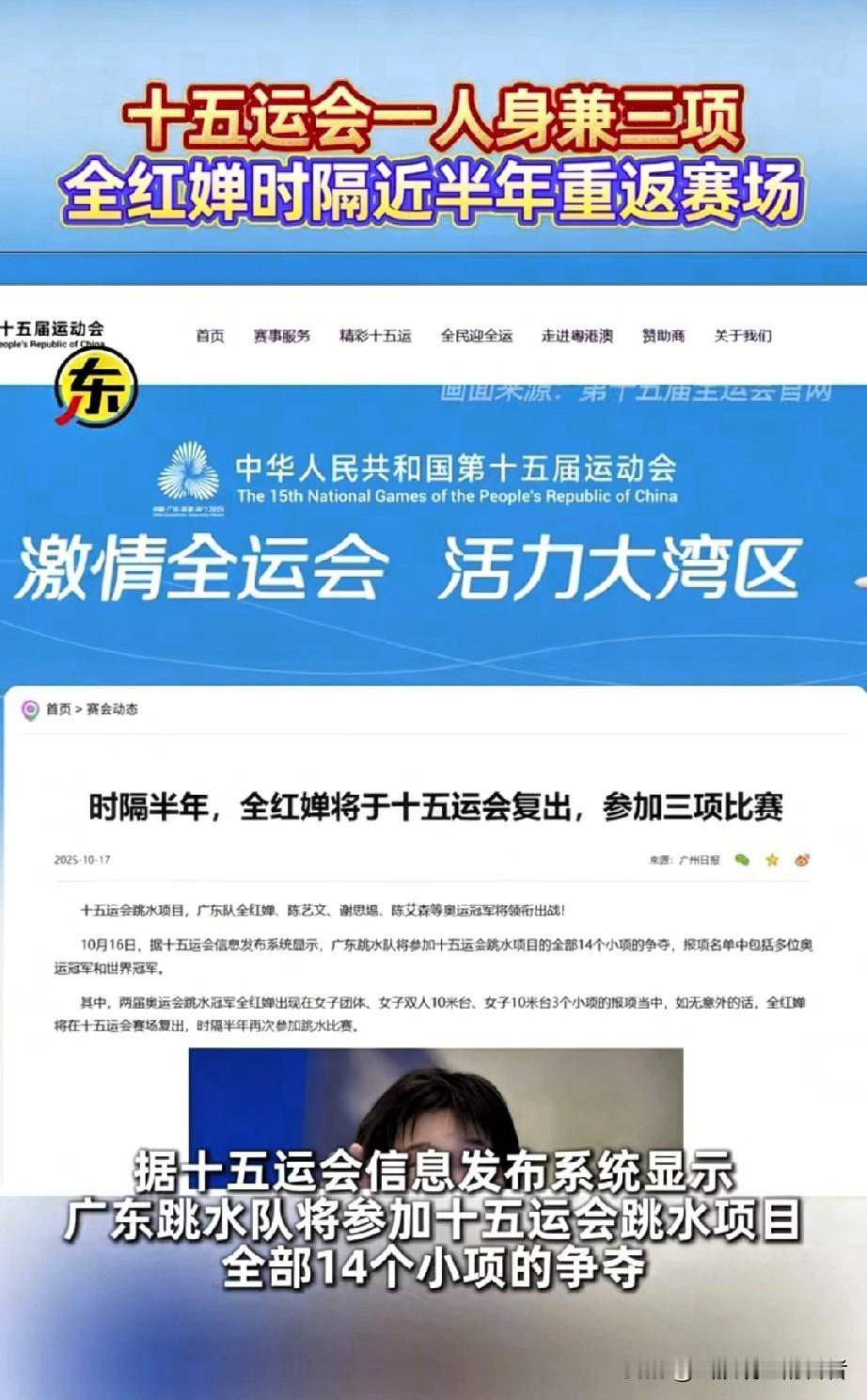 谁能想到,半年没参赛的全红婵,仅凭一条复出消息就引爆了全网? 这一次,没有奥运夺冠的惊天逆转,也没有世界杯摘金的高光时刻,只是大湾区全运会的一纸参赛名单,就让无数粉丝瞬间沸腾。上届全运会狂揽两金的“跳水天才”,这次直接豪横地报了女子团体、女子双人十米台、女子单人十米台三个项目,剑指三金王。教练透露,她闭关的这五个月没白练,技术动作比以前更细腻、更稳定了。 从东京奥运会横空出世的14岁黑马,到如今扛起大旗的领军人物,全红婵的每一次起跳都牵动着人心。半年的等待,终于盼来了她重返跳台的时刻。