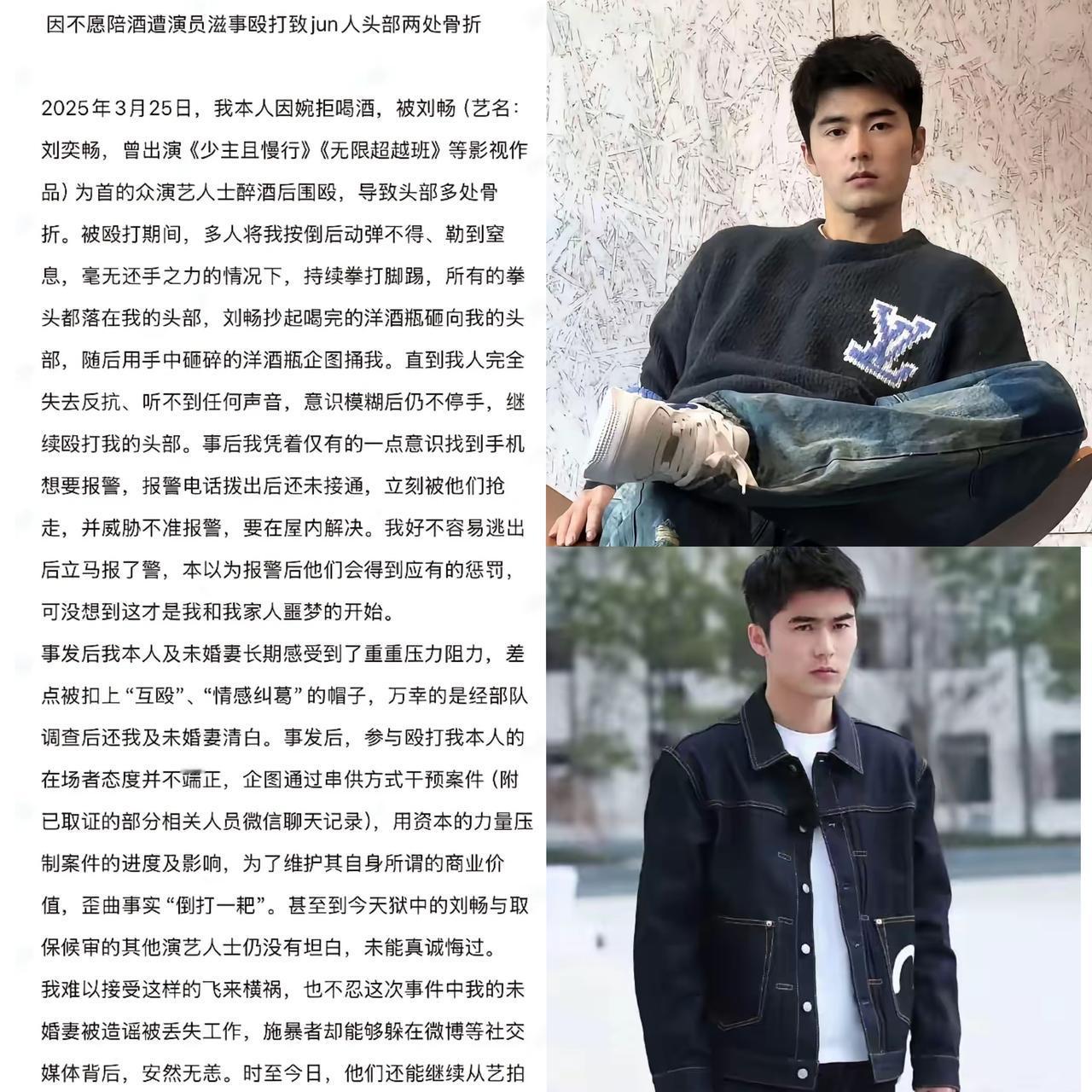 如果军人梁先生不同意调解,那么,这个刘奕畅和其他几位“兄弟”难免要受牢狱之灾。 刘奕畅这瓶洋酒砸下去,砸的哪是军人的头,分明是自己的饭碗和法治的脸!就因为人家拒绝陪酒,直接抄起瓶子往头上招呼,打晕了还不停手,事后居然还想串供、找关系压事,真把自己当特权阶级了? 亏他还是演过戏的,真以为“有关系能摆平一切”是剧本里的金手指?梁先生拒绝调解太对了,这种把暴力当威风的主儿,就得让法律好好教教他怎么做人。故意伤害致轻伤二级,再加上殴打军人这个从重情节,牢狱之灾跑不了。 更可笑的是,这边刚被刑拘,那边新剧宣传就被连夜下架,代言也全撤了。娱乐圈的光环从来不是免罪符,反而该是更高的约束。真当观众会为施暴者买账?