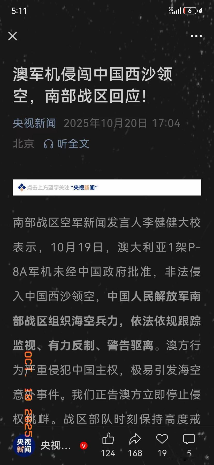 澳军P-8A又来西沙“碰瓷”? 这波反制看得太解气! 之前说被激光照伤的说法早被戳破是假的,可澳方压根没长记性,10月19号又把军机开到我国西沙领空来了。真当南海是他家后花园? 中方直接派兵力跟踪监视,还依法反制驱离。结果澳方倒打一耙,喊着被“危险拦截”,这话听着都可笑——私闯别人家门,还不许主人拦了? 别觉得“没打下来”就是怂,这恰恰是底气:咱们的反制有理有据,既守住了主权,又挑不出错处。一次次来挑衅,不过是想抱美国大腿刷存在感,可惜每次都碰一鼻子灰。 对付这种“碰瓷式侦察”,就得这么刚!你觉得下次该怎么回应才更有力?评论区聊聊~