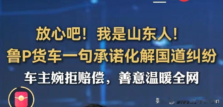太实在了!这就是咱山东人! 这两天,一段视频刷爆了朋友圈。在国道上,一辆鲁P牌照的大货车轮胎掉了,砸到了罗先生的引擎盖。一般人遇到这事,心里都得咯噔一下,怕扯皮怕赔钱。 可这位鲁P车主大哥,一下车就先道歉,一句“放心吧!我是山东人!该我负责的我一定负责”,瞬间化解了对方的火气。 更让人暖心的是,被砸车的车主看到大哥这么实在,直接联系他说:“不用赔了,你也不是故意的,都不容易!” 温暖全网的不是赔偿金额,而是这份将心比心的体谅。一个主动担当,一个宽容大度,这才是路上最美的风景! 有人说,这是“鲁P”的胜利。 要我说,这是刻在山东人骨子里的“仁义厚道”赢了。 咱山东人可能不会说漂亮话,但吐个唾沫是个钉,说到做到! 为这两位大哥点赞!希望这样的善意能传递下去,让出门在外的司机们,都能感受到这份温暖!