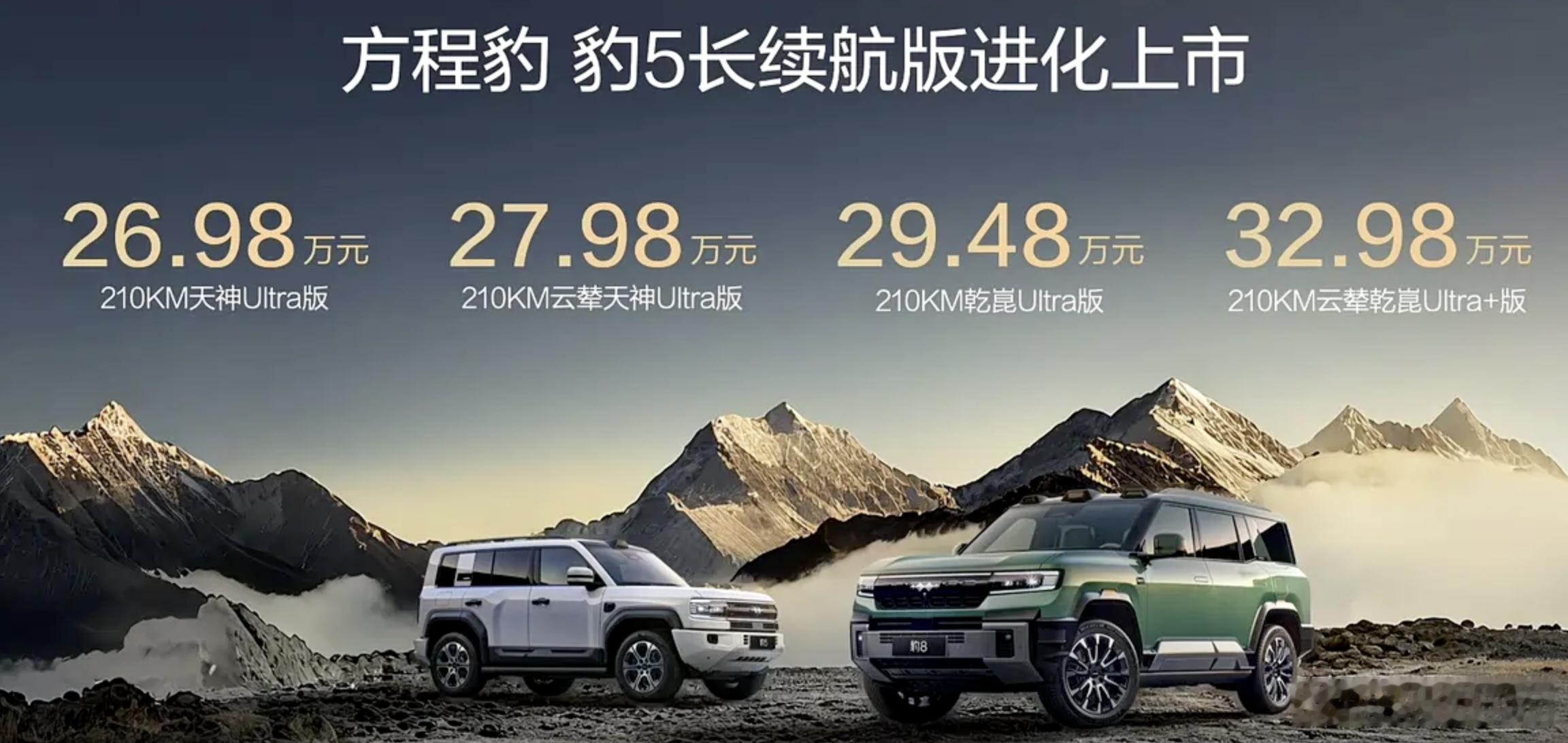 豹5的关键词是长续航版,指导价是价格26.98万-32.98万元,老款车型的价格是23.98万-32.98万,不过这并不是豹5涨价了,大概率是因为老款23.98万的入门版车型卖从比例较少,因为这个版本虽然价格便宜,但是没有按摩、没有HUD、没有电吸尾门等等配置。