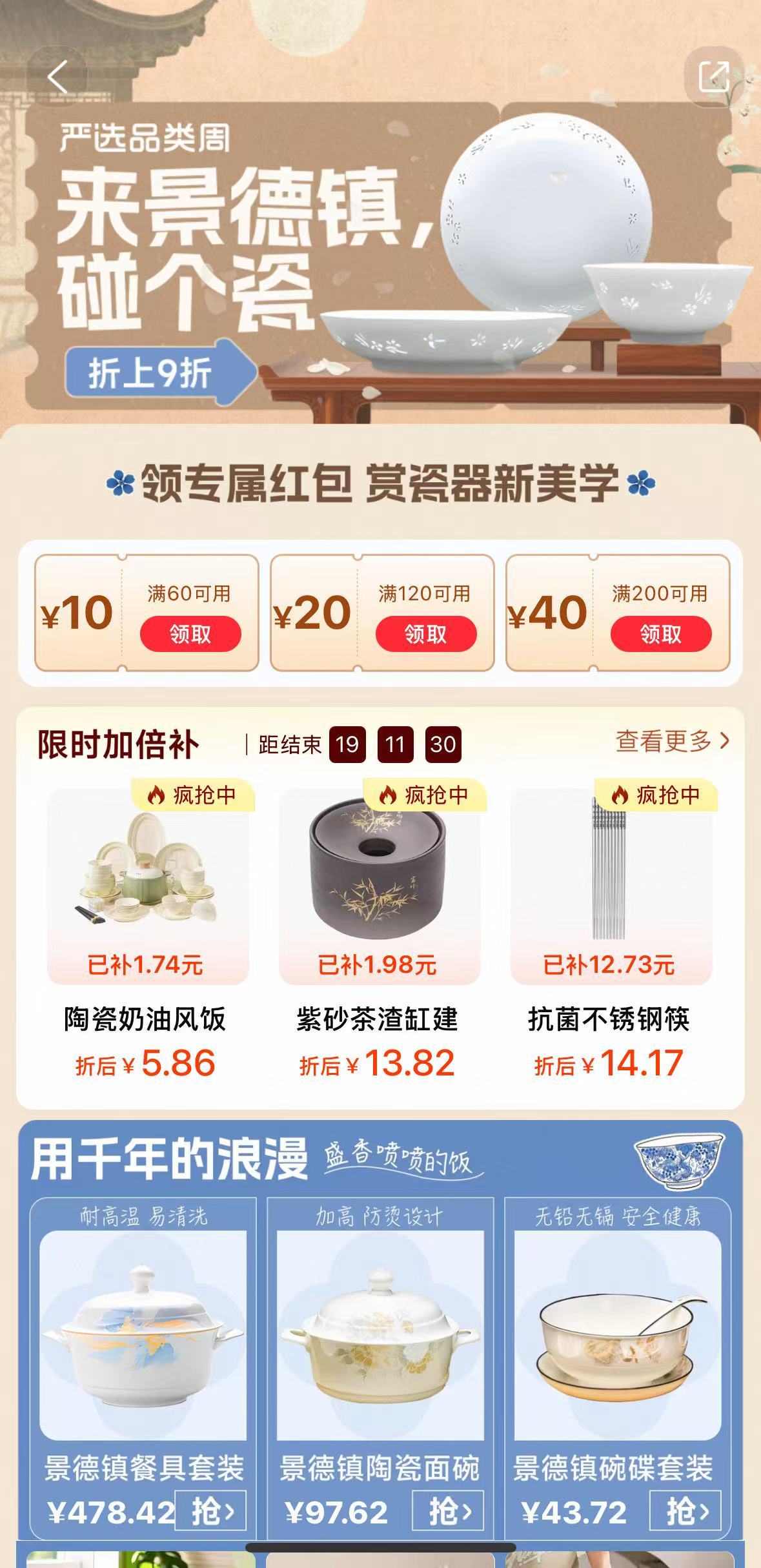 脆皮大学生,终于在景德镇遍地的陶艺工坊找到了“精神代餐”,U1S1捏塑泥巴比赶due轻松百倍!每天都能逛雕塑瓷厂早市,十几块钱就能淘到手绘小茶杯,逛累了蹲在路边吃包麻糍,抬头就是爬满涂鸦的老砖窑,连空气里都飘着不用卷绩点的松弛感。来不了景德镇,也可以双11上淘宝搜「国货严选」,点击进入活动专区,再点击红包活动主页,还能抢7亿惊喜红包,这波仪式感拉满上国货严选get景德镇好瓷器