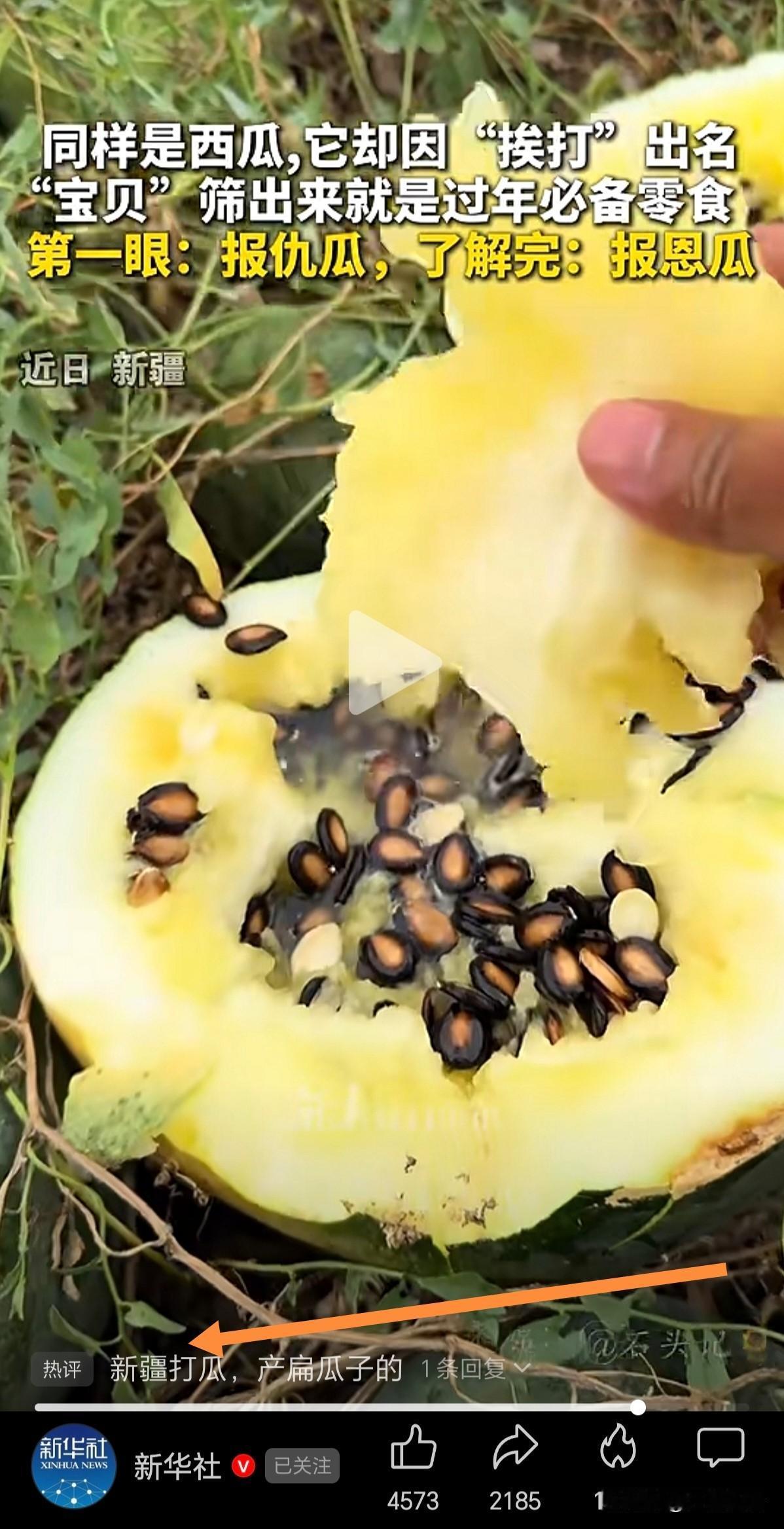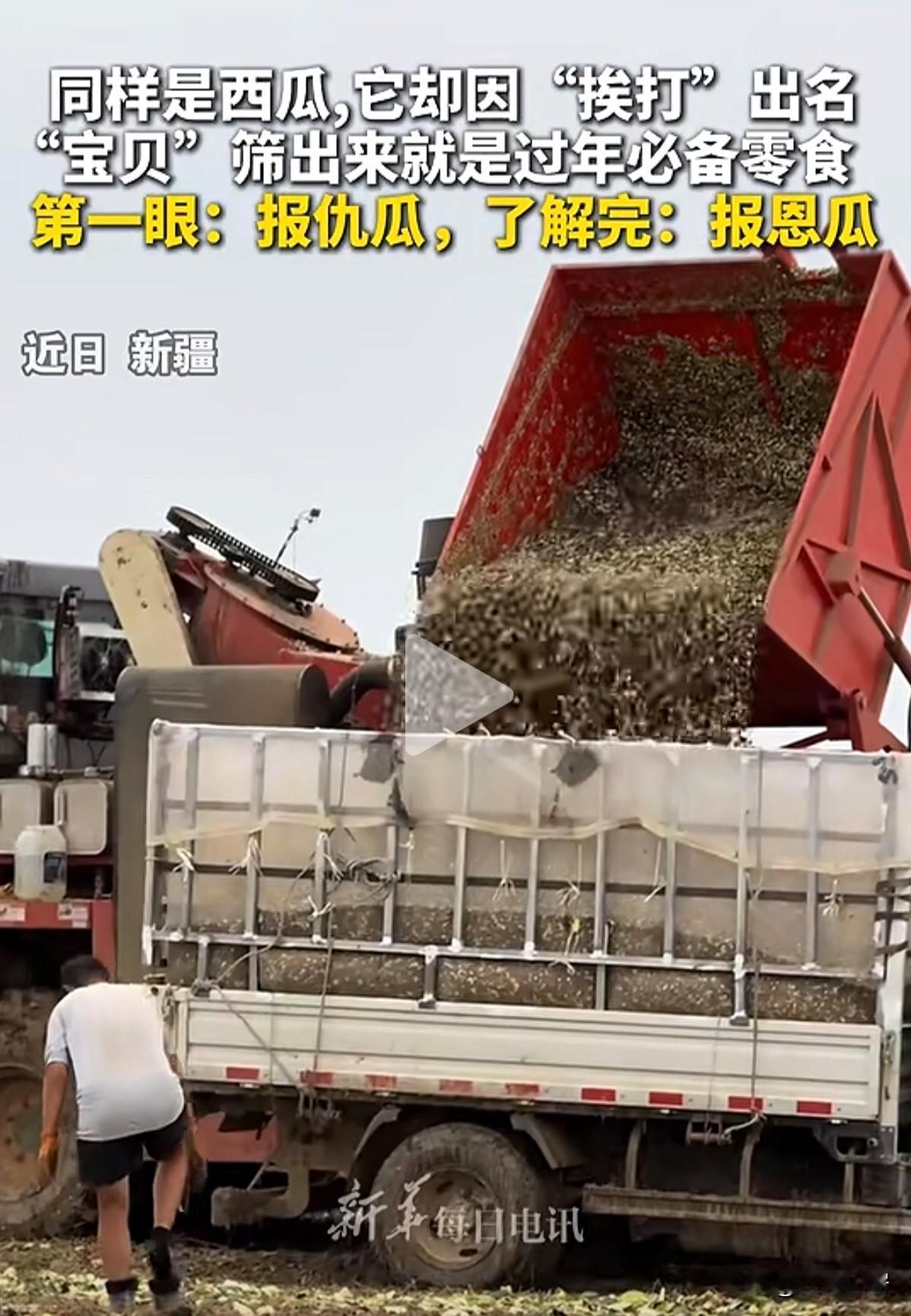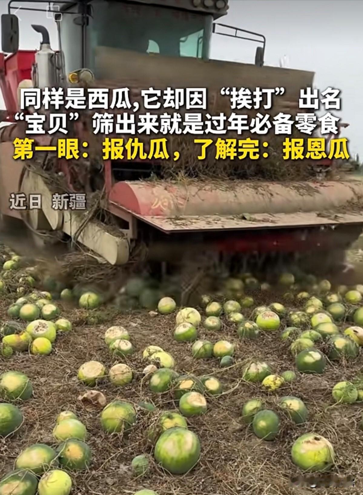 原来你吃的扁瓜子是这样来的。在新疆,它也叫打瓜,是专门产扁瓜子的。过年期间,你在家里置办的年货中,吃到的扁瓜子,就是它了。同样是西瓜,这个打瓜,却因为“挨打”而出名。用机器收货之后,产出来的就是一车车的扁瓜子。没错,我们常见的,坚果礼盒中的扁瓜子,就是出自这种报恩瓜-打瓜。瞬间涨知识了!涨知识