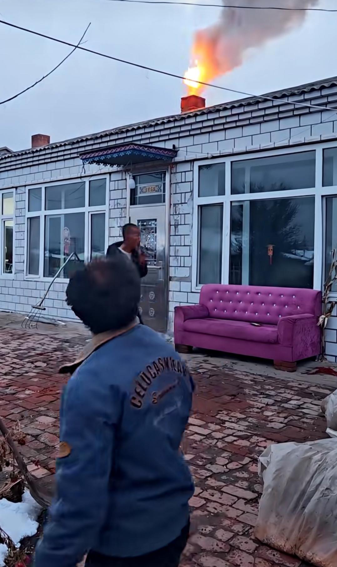 烟囱着火很常见,烟囱里有常年累月积累的粉尘,或者说炭粒,不会烧火的人非常容易把烟囱烧着了,我小时候就经常会,烧着了就拿一根长竹竿去屋顶捅一捅,把那些结块的渣子捅下来就好了;