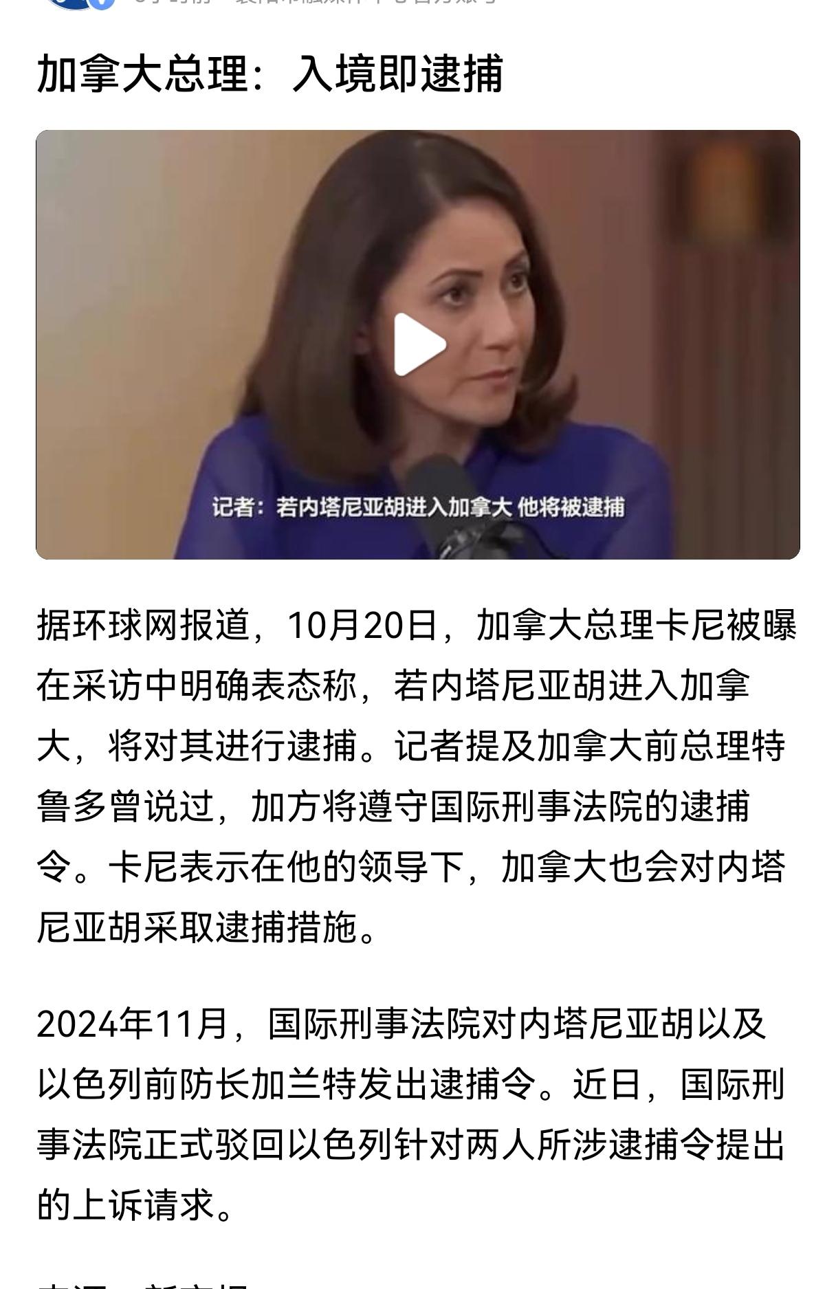 一句空话:加拿大总理要逮捕内塔尼亚胡 美国拼命保内塔尼亚胡,加拿大作为美国的小弟敢逮捕内塔尼亚胡?借它一百个胆也不敢! 那么加拿大总理卡尼为什么要这样说呢?想在世界上树立一个独立外交的形象罢了。加拿大做美国的附庸做久了,但特朗普还不满足,还想让加拿大做美国的一个州,伤了加拿大那颗脆弱的心,加拿大想在口头上反抗一下而已。 就是这种口头反抗,也没人会理睬。加拿大想逮捕内塔尼亚胡的前提是内塔尼亚胡跑到加拿大去,内塔尼亚胡有这么傻么?特朗普、内塔尼亚胡、卡尼都在过嘴瘾而已。