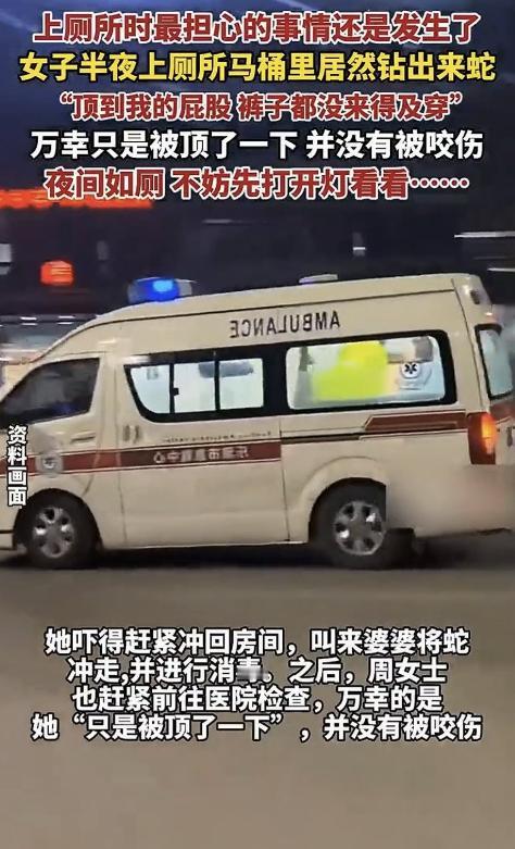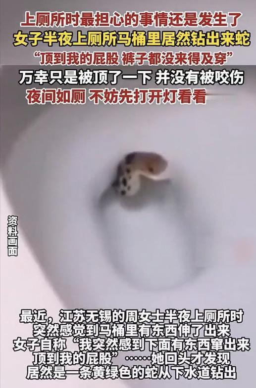 幸亏跑得快!江苏一女子半夜上厕所,突然感觉下面有东西伸出来,顶到了皮燕子,女子还以为是纸巾,结果回头才发现,居然是一条黄绿色的蛇,竟然从下水道钻出,吓得她裤子都没提,就赶紧冲回房间,叫来婆婆将蛇冲走。 据杭州网10月20日报道,江苏一个女的,半夜三点多起来上厕所,她没开灯,迷迷糊糊就摸到卫生间,把裤子褪下去就坐在了马桶上。 刚一坐稳,她就感觉不对劲,马桶下面有个冰凉的东西,动了一下,还顶了她的屁股一下,那个感觉很奇怪,滑溜溜的,她心里咯噔一下,瞬间就清醒了。 她立刻从马桶上跳了起来,赶紧转身把卫生间的灯打开,灯一亮,她低头往马桶里看,当时就吓得腿软了。 马桶下水道的洞口那,有一条蛇,蛇是黄绿色的,大概有筷子那么粗,上半身已经从洞里钻了出来,头还歪在一边。 刚才顶她的,就是这个蛇的头,这个女的当时脑子就空了,吓得大叫了一声,她裤子都没顾得上提,直接就从卫生间冲了出去。 她跑去敲婆婆的房门,因为吓得厉害,话都说不清楚,一个劲儿指着卫生间的方向,她婆婆被叫醒后,看到儿媳妇吓成那个样子,也知道事情不小。 听明白是马桶里有蛇之后,她婆婆胆子比较大,就自己一个人进了卫生间去看,果然,那条蛇还在马桶里,好像还想往上爬,她婆婆没慌,直接按了马桶的冲水键。 水一下子冲下去,就把那条蛇卷回下水道里了,她不放心,又连续按了好几次冲水,之后,还拿消毒水把整个卫生间都给洗了一遍,蛇是冲走了,但是那个女的还是吓得不行。 被蛇顶的那一下冰凉滑腻的感觉,她怎么也忘不掉,总觉得自己好像被咬了,但又找不到伤口,第二天一早,她婆婆就陪她去了医院。 医生给她从头到脚检查了一遍,还好,身上没有被蛇咬到的伤口,医生说只是被吓到了,身体没事。 其实,这种事在老小区的一楼特别容易发生,因为老小区的下水管都是铁的,时间长了会生锈、会有破洞,这些管子又连着外面的下水道和化粪池,那些地方蛇和虫子特别多,天一热,它们就可能顺着管子上的破洞爬到家里来。 这件事也提醒了很多人,住老房子不能不当心,马桶平时不用的时候最好把盖子盖上,地漏也要用那种能防虫的,这些小事情看着不起眼,但真能防止这些吓人的东西爬进家里。 总的来说,这个女的运气算好的,只是被吓到了,人没受伤,但这事也确实是个教训,家里的安全问题,自己不多注意是不行的,万一真出了事,后悔就晚了。 信源:杭州网2025-10-20——女子半夜上厕所,马桶里居然钻出一条蛇,“顶到我的屁股,,吓得裤子都没提就跑