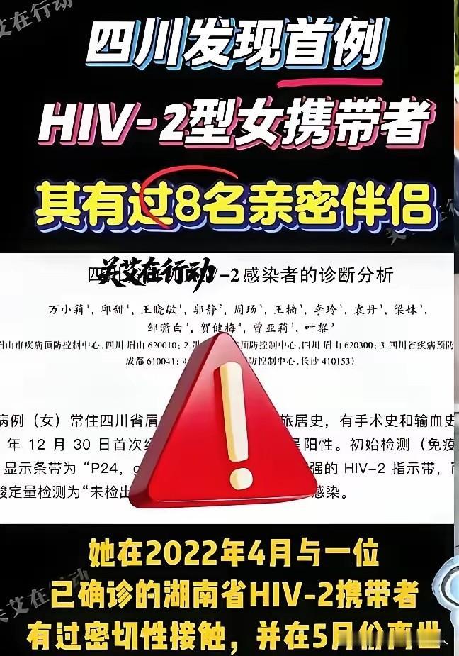 现在全网最瑟瑟发抖的 应该是就是那位 67岁四川大妈与8名性接触者吧!7位可能后悔不已,连累到家人的是:洁身自好,保全身家。近几日,四川一大妈因为HIV-2型感染被查出,该大妈67岁了,还不想着养儿防老,竟然与人发生性关系。她与一名湖南男子在2022年4月发生性关系,2022年5月该男子去世,2023年1月她查出HIV-2型感染,与8名性接触者被查。这7位性接触者可能后悔不已,自己为什么要和大妈发生性关系。大妈67岁了,还与人发生性关系,真的不害臊。这事告诉我们:洁身自好,身才可以保,家才可以安。