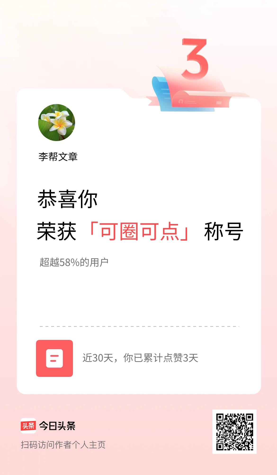 我在头条30天内点赞打卡3天,获得“可圈可点”称号