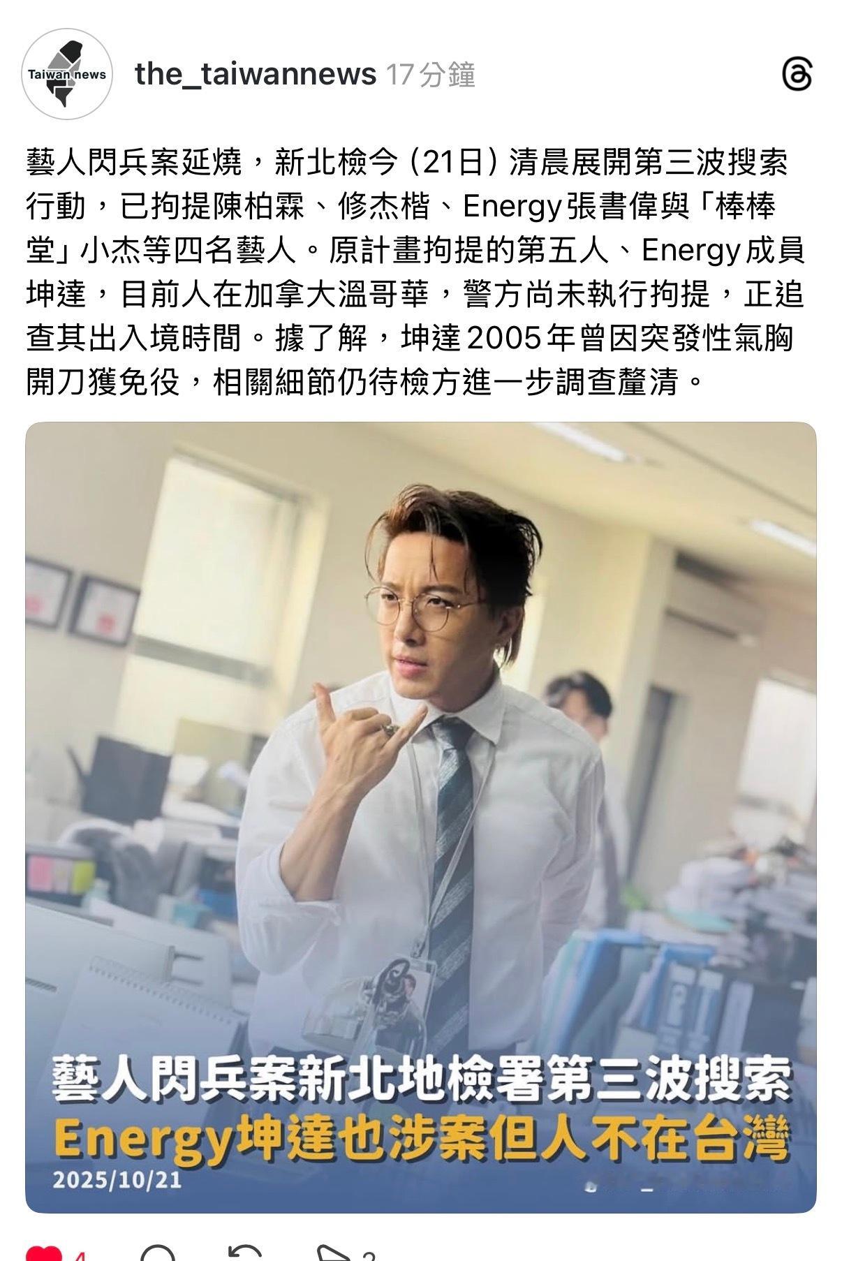 据新闻报道,他正好在今👮上门前出境前往加拿大温哥华,预计10天后才会返台,而妻子柯佳嬿向👮表示他是为了工作而出境,👮正在厘清坤达出入境时间,只要返台一落地就会被警方拘提到案。