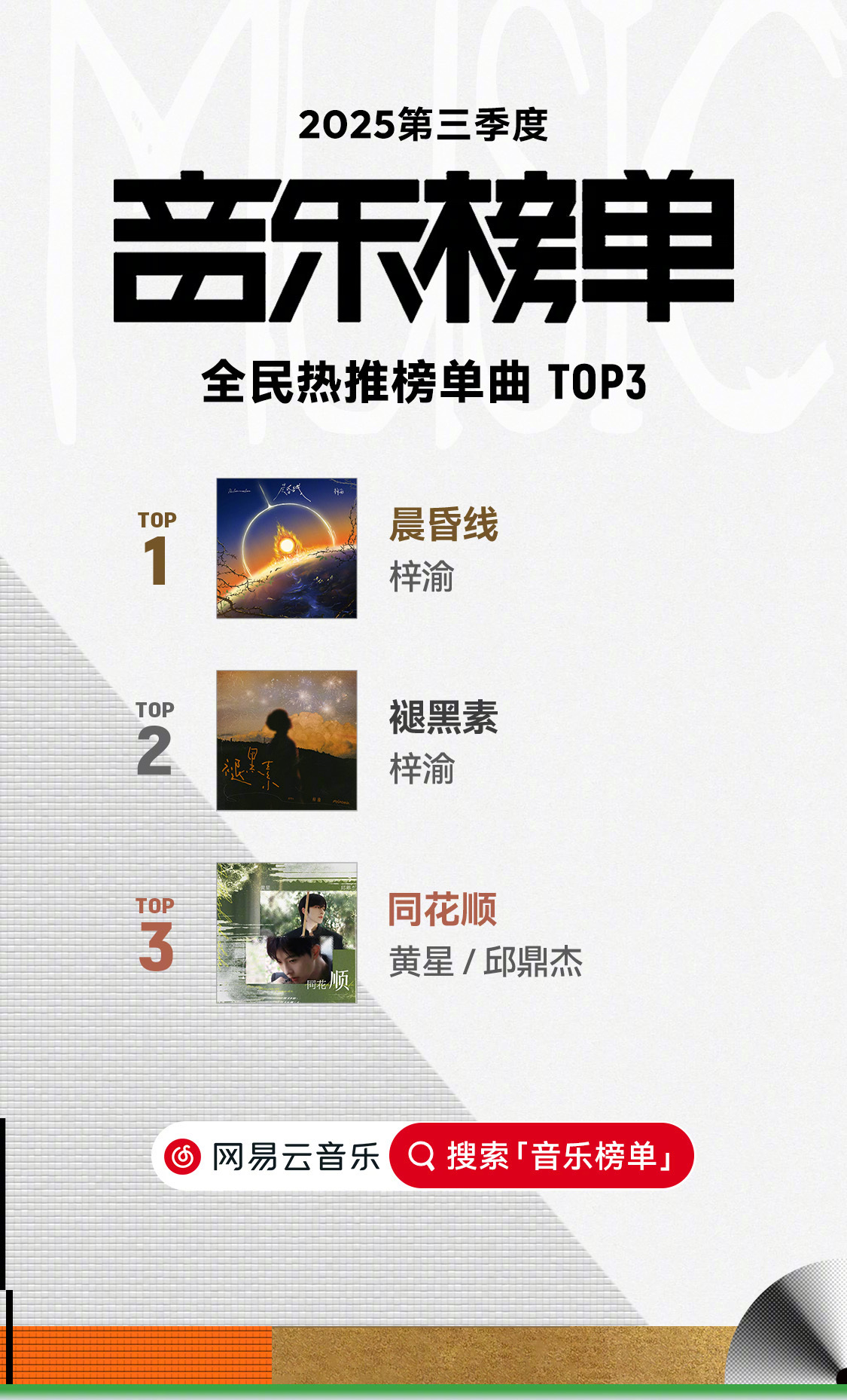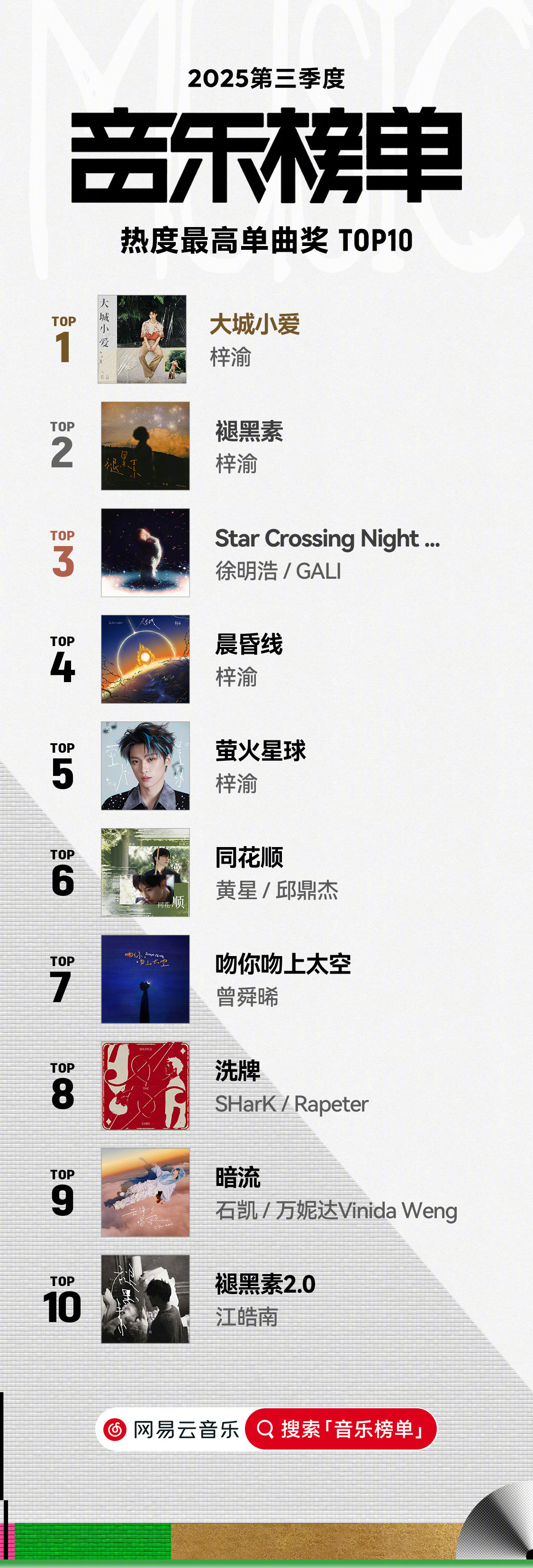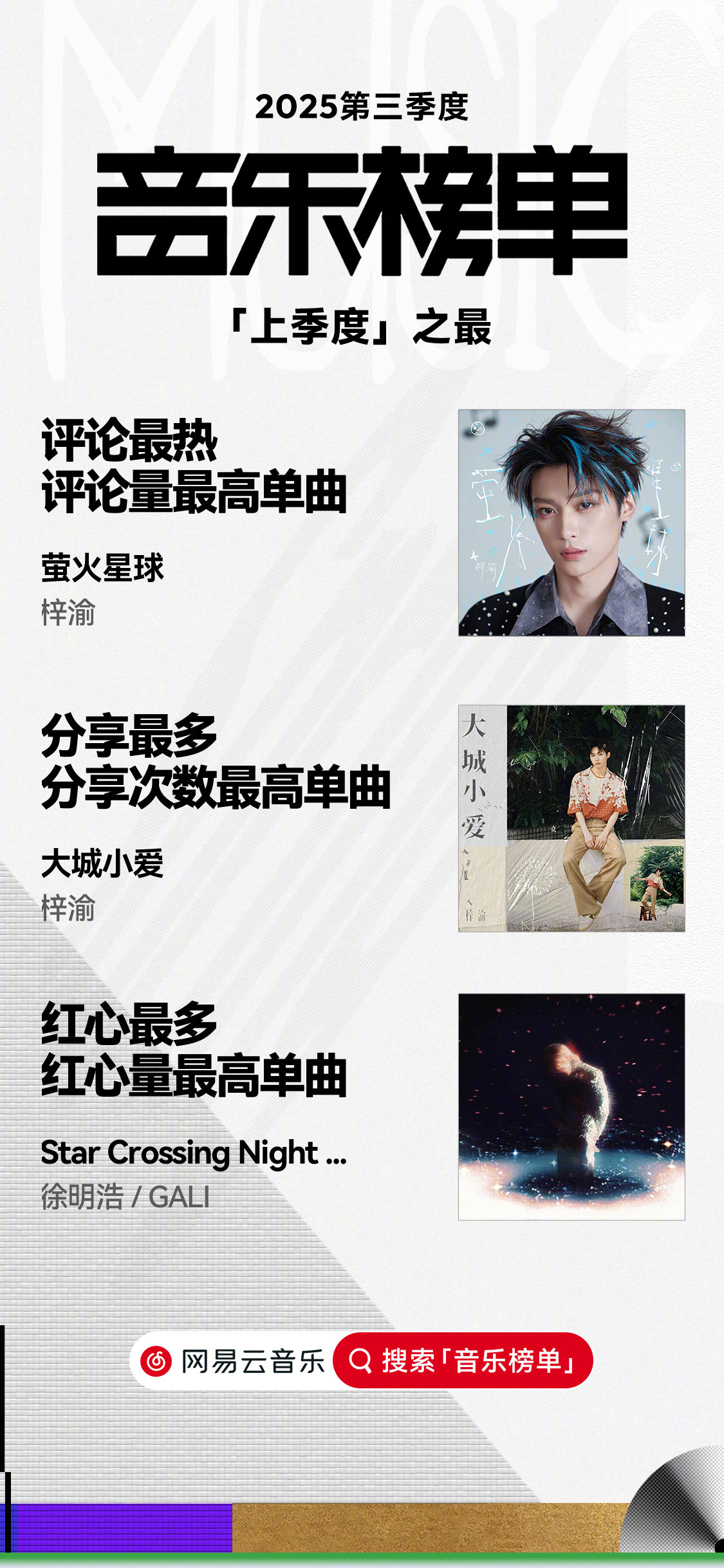 网易云音乐公布第三季度音乐榜单,梓渝凭借《大城小爱》获得本季热度最高单曲TOP1,另外《褪黑素》、《萤火星球》也分别稳居几个榜单的首位,期待梓渝之后的精彩表现~