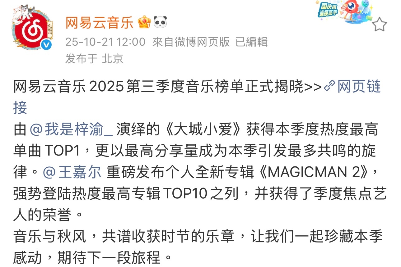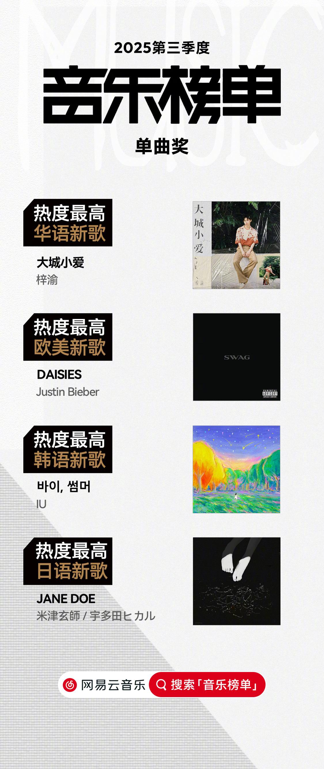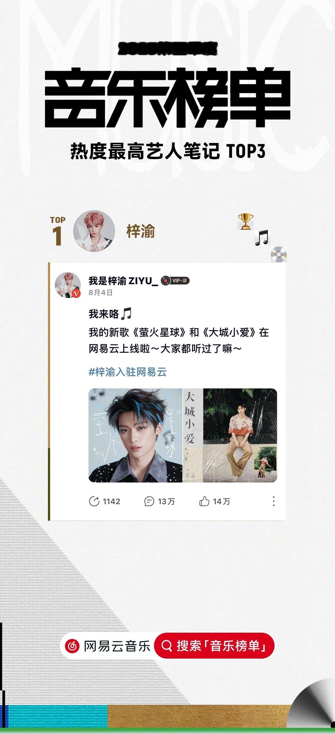 网易云音乐公布第三季度音乐榜单,梓渝凭借《大城小爱》获得本季热度最高单曲TOP1,另外《褪黑素》、《萤火星球》也分别稳居几个榜单的首位,期待梓渝之后的精彩表现~