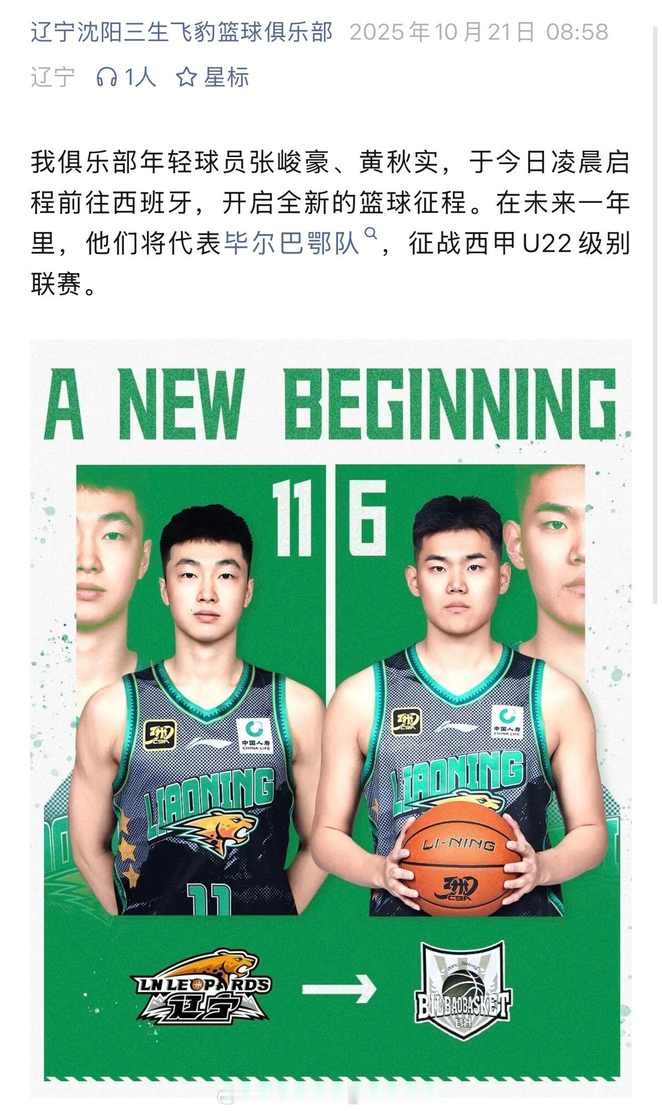 一切都是最好的安排,辽宁男篮官方发文祝福张峻豪啊和黄秋实:两名小将加盟西甲毕尔巴
