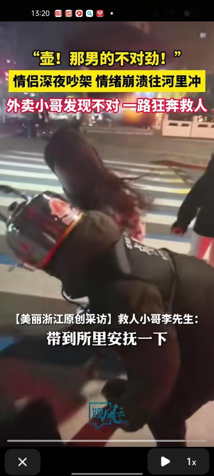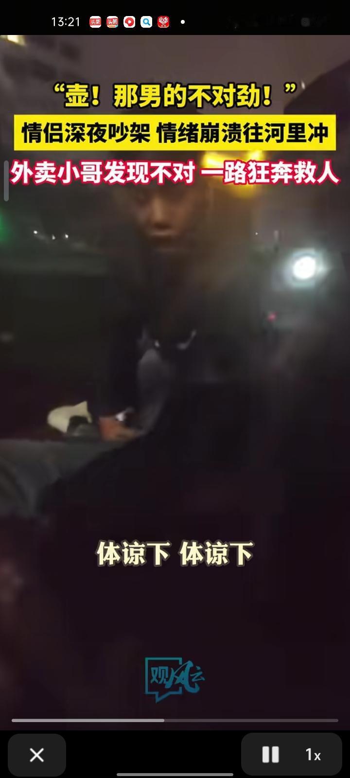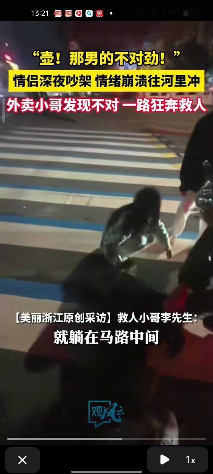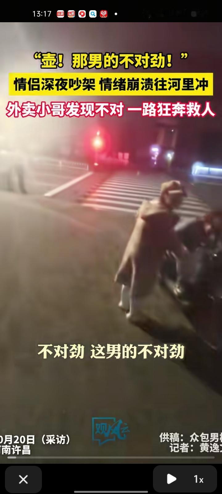10月18日,河南许昌。外卖骑手等单子时,发现一对小情侣吵得很激烈,男子情绪崩溃想要往河里跳。随后,外卖骑手和同行一路狂奔救人。他们把男的救上来后,女方也情绪崩溃,躺在马路中间等车压过,外卖骑手把车停在路边并打开双闪,随后男方又跑向对岸河边,他们快步追上。事后,骑手们报了警,民警把两个小情侣带到派出所安抚。
