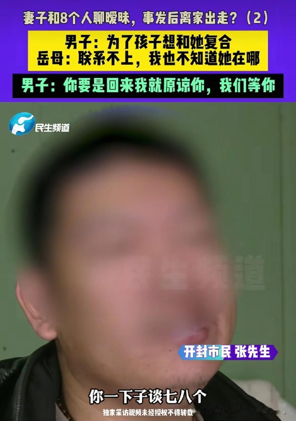 男子发现17年的妻子同时和8个男人搞暧昧,男子就找妻子理论讨要说法,妻子被发现后直接说要离婚。 河南开封的张先生有三个孩子,张先生为了这个家庭一直在外打工赚钱养家,家里有事张先生才回家一趟。 这次是小闺女在学校受欺负了,张先生作询问妻子情况,张先生想让小闺女接电话,妻子不让说,闺女不想理他。 张先生询问妻子在看吗,妻子回答在看电视,张先生没听得到电视的声音,感觉事情有点奇怪,自己妻子以前不是这样的人,现在变的自己有点不认识了。 张先生决定回家一趟看看情况,回到家后张先生看妻子一直拿着手机也不理自己,张先生抢过妻子的手机,发现自己和8个男人在聊天,内容很暧昧,这些话两人17年了都没说过。 不仅暧昧,妻子和这几个男人私底下还见了面,气不过的张先生对妻子动手了,询问妻子为啥出轨给我带绿帽子,妻子也不想和张先生过了,直接说要离婚,就离开了这个家。 事后张先生决定孩子还有三个孩子,离婚了孩子谁照顾,自己还要赚钱养家,照顾三个孩子怎么出去打工。 张先生就想让妻子回来,决定原谅妻子的所作所为,就找到记者帮忙,记者找到张先生的丈母娘询问情况,丈母娘也不知道情况。 现在家里的三个孩子都很想妈妈,想让妈妈早点回来,张先生为了这个家,常年在外面打工,还债盖房子,忽略的妻子的感受,张先生说,只要妻子回来就原谅她,家人还在等你回来,我们还有一个家!