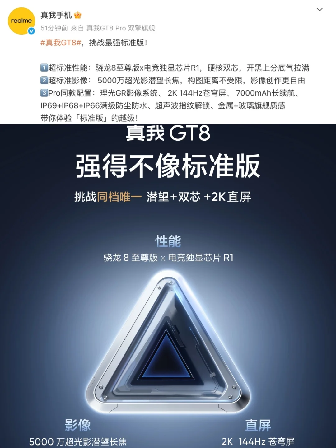 今天真我GT8标准版也开始宣传了,有多Pro同款配置,同款2K 144Hz苍穹屏幕、7000mah大电池、超声波指纹、理光GR系统等,还上了潜望长焦、独显芯片、满级防水...确实一点也不像标准版