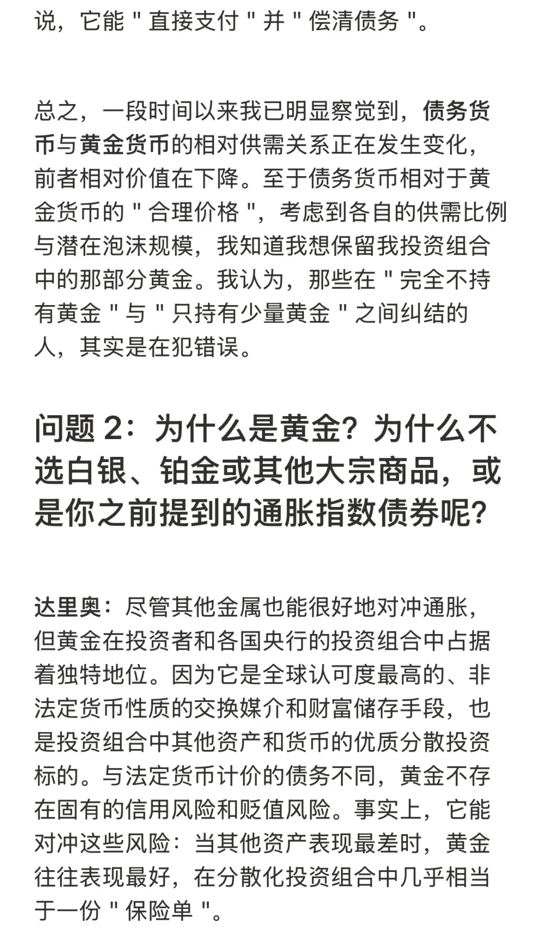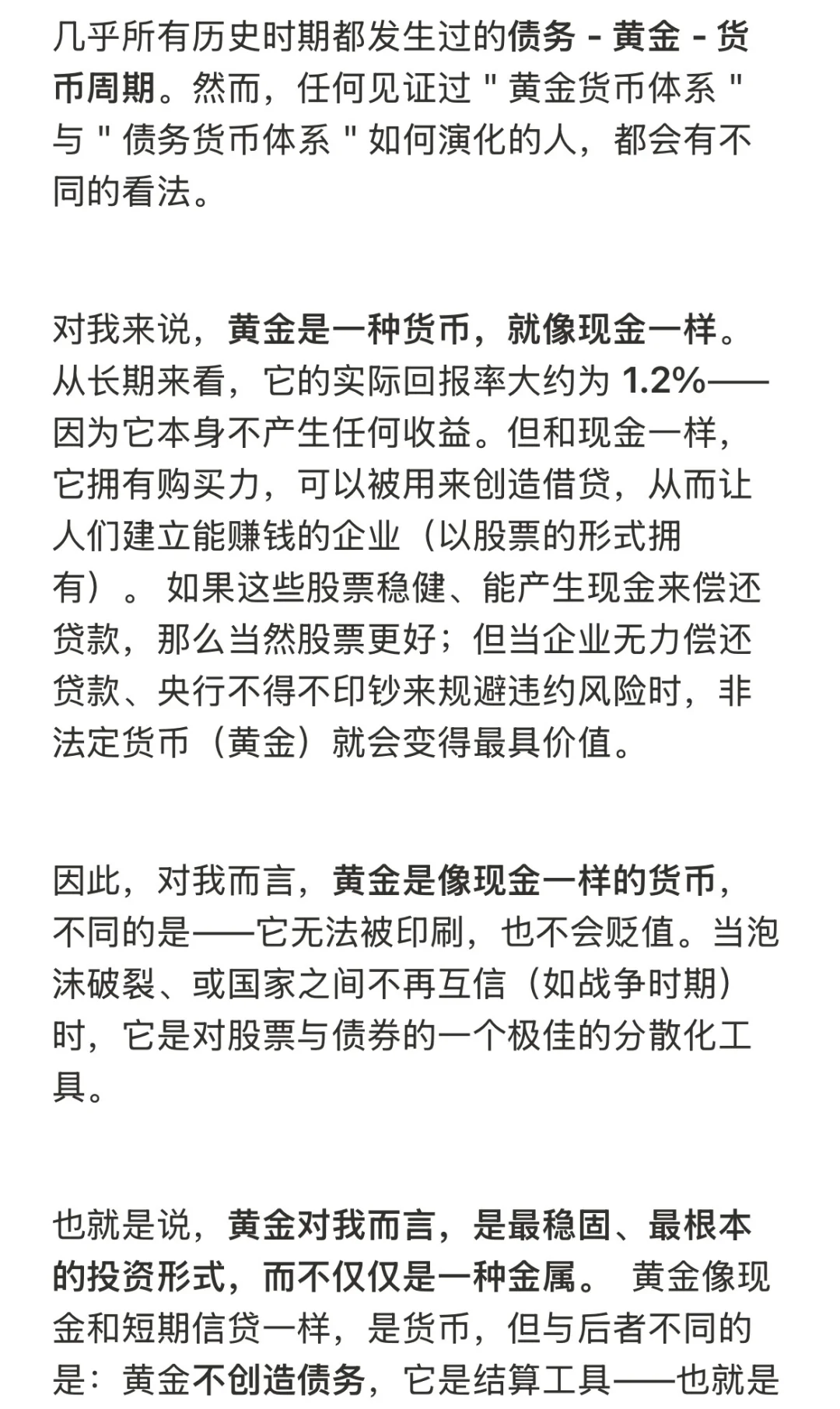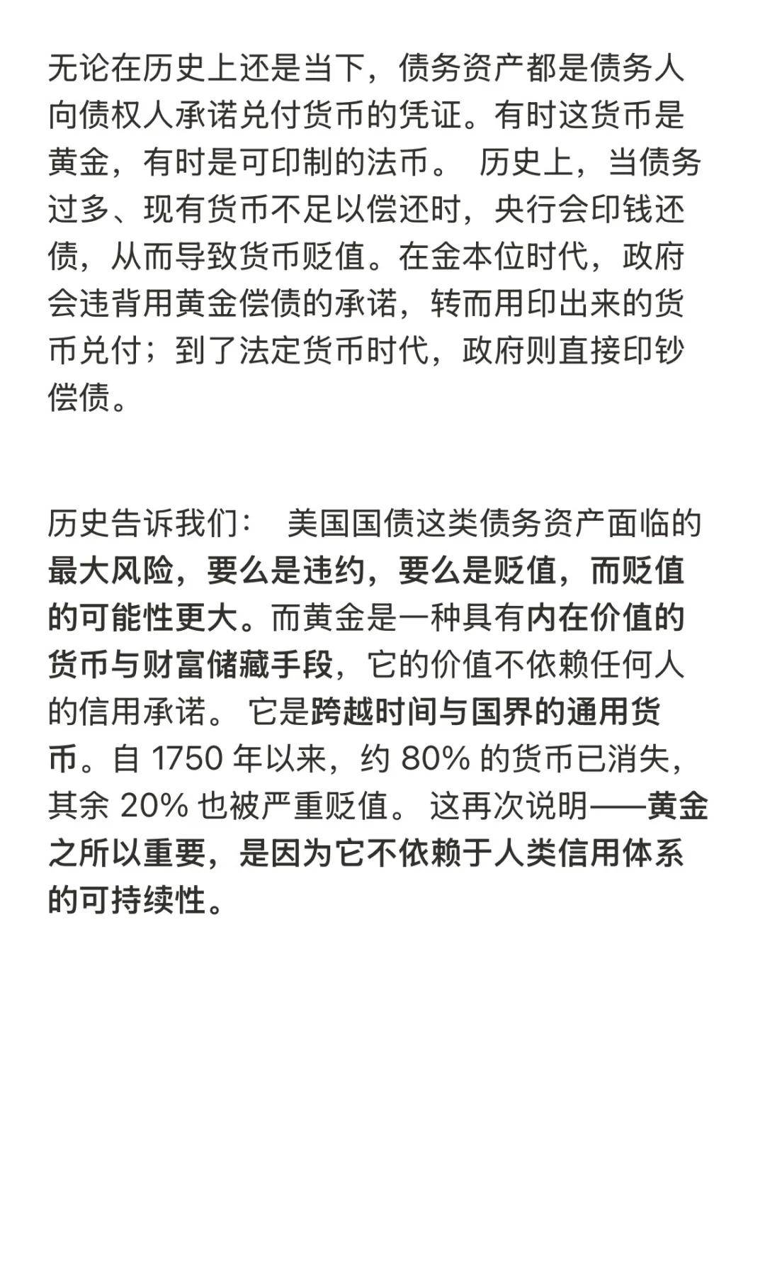 黄金与法定货币有本质区别。法定货币实质上是债务,而黄金则是结算工具,能直接支付并偿清债务而不创造新债务。最关键的是,"黄金无法被印刷,也不会贬值"。
