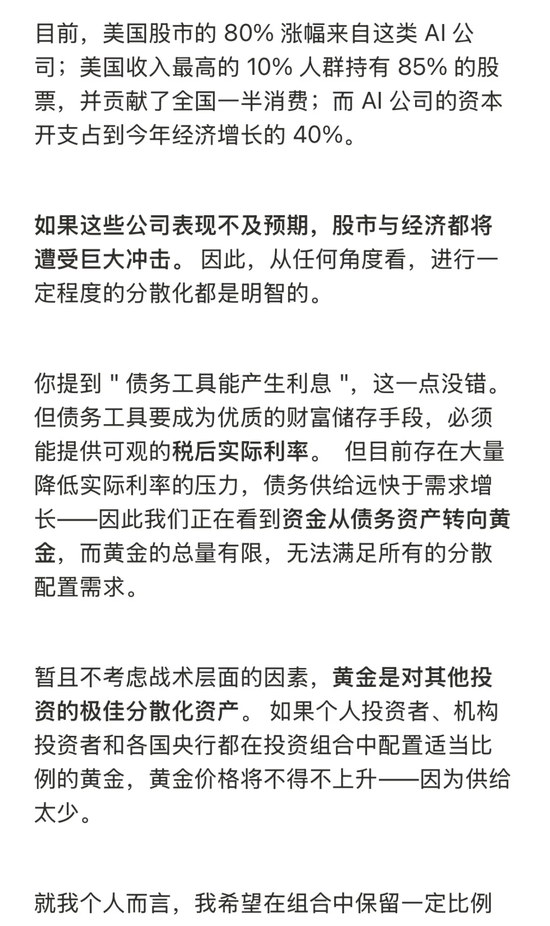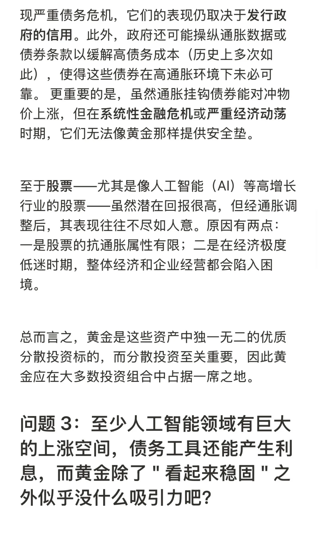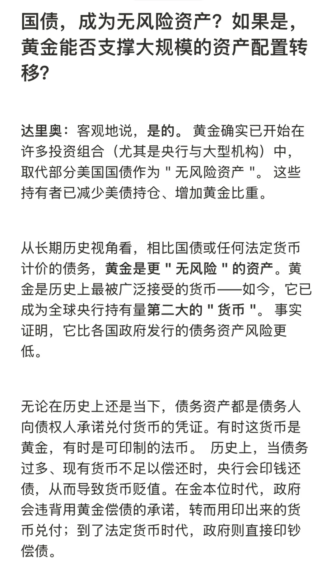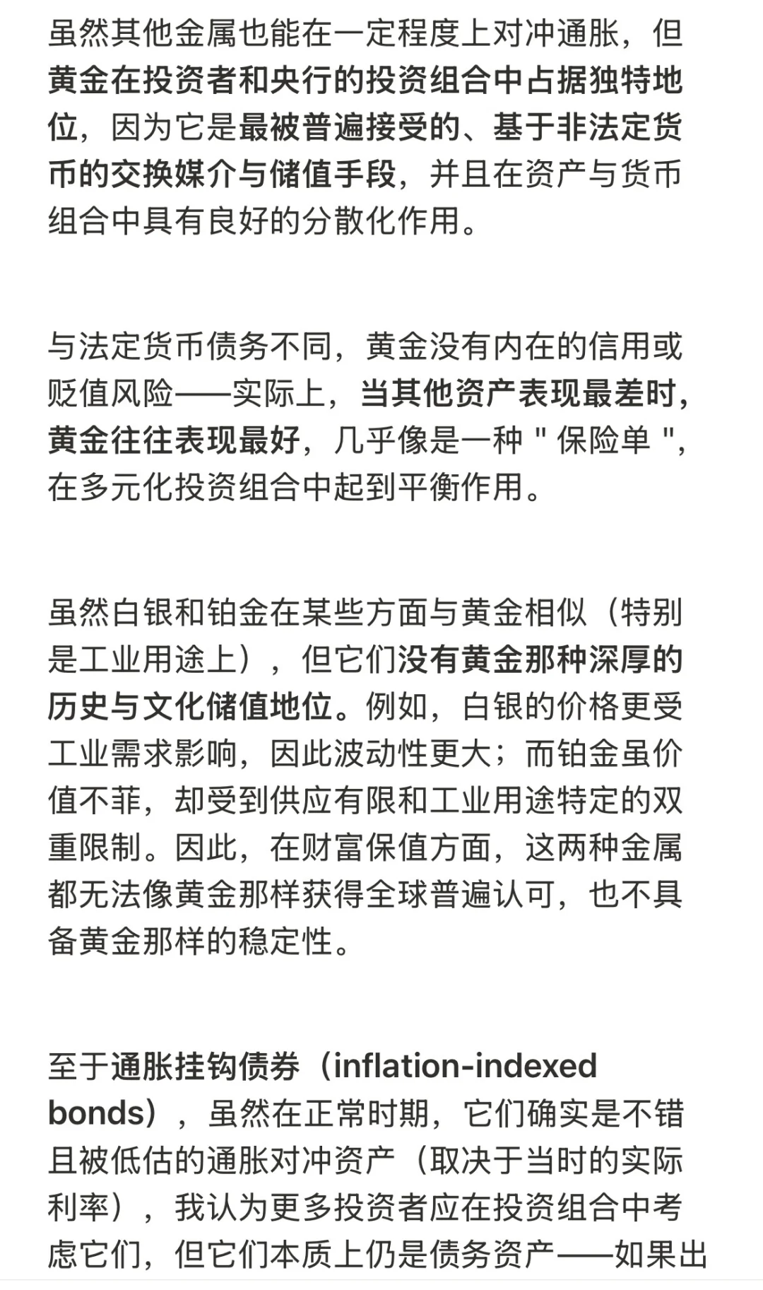 黄金与法定货币有本质区别。法定货币实质上是债务,而黄金则是结算工具,能直接支付并偿清债务而不创造新债务。最关键的是,"黄金无法被印刷,也不会贬值"。