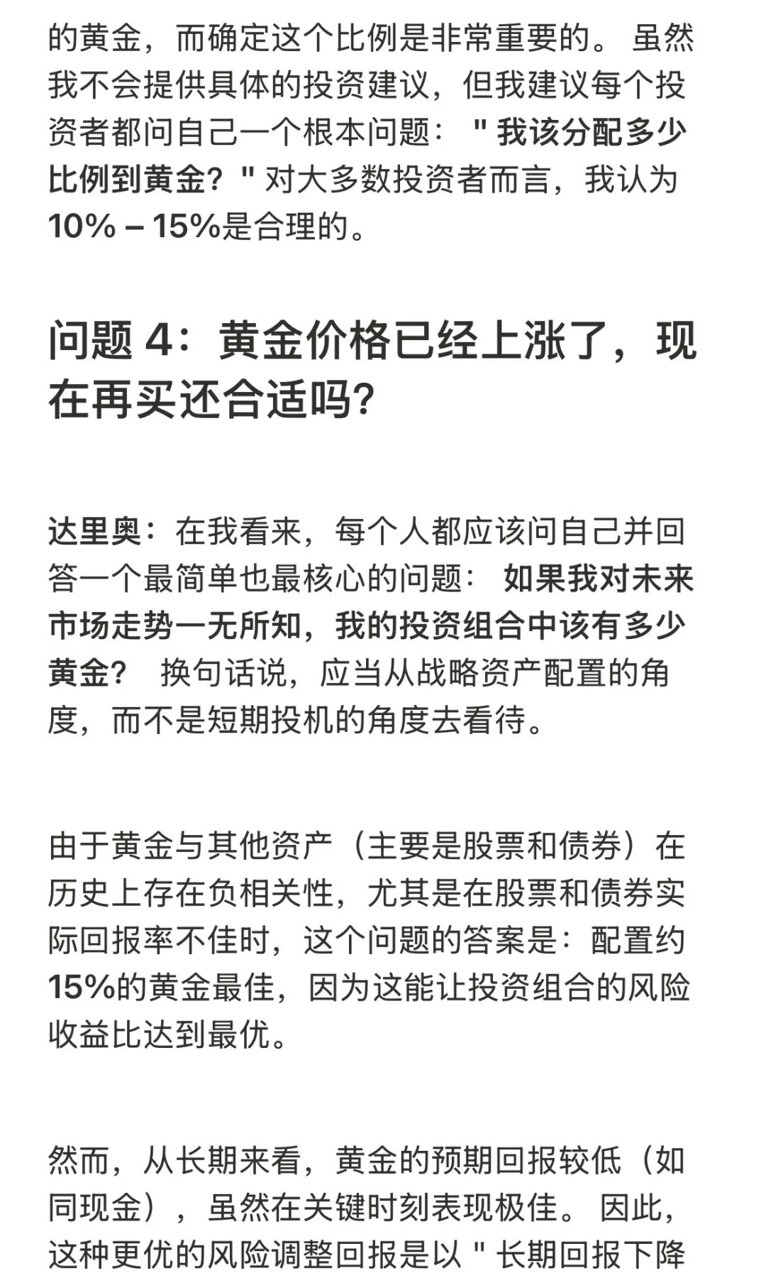 在投资组合中,黄金扮演着独特角色。当泡沫破裂、国家间互信缺失时,黄金是对股票与债券的极佳分散工具。当其他资产表现最差时,黄金往往表现最好,分散化投资组合中相当于一份'保险单'。