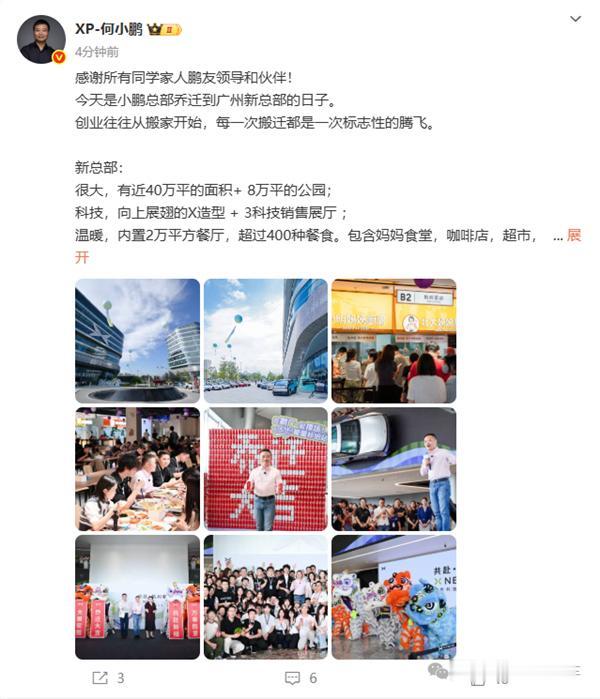 小鹏总部搬家 近日,小鹏汽车正式乔迁广州天河智慧城新总部。何小鹏发微博庆祝:“创业往往从搬家开始,每一次搬迁都是一次标志性的腾飞。”
