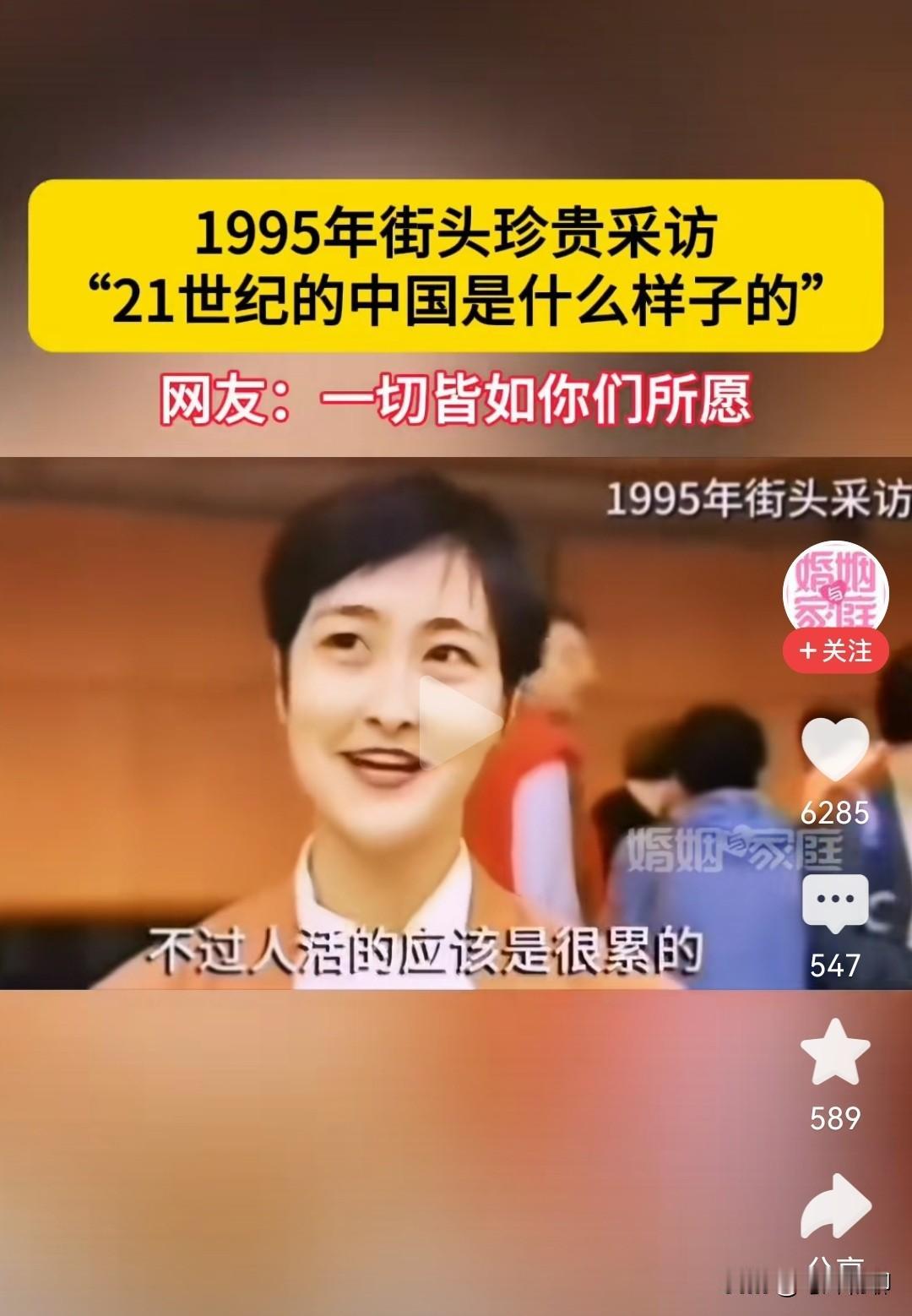 今天刷到一段95年的街头采访,从视频中可以看出,那会的人看着都很精神,眼神很清澈,虽然那会生活不富裕,但起码人活得很快乐。 记者问,你认为21世纪的中国会是什么样子?有路人回答说,应该和美国日本差不多吧,很有发展前途,不过人活得应该很累的。 咱也不说目前的生活水平能否赶上美国日本,光她说得那句“人活得应该是很累的”,就不知刺痛了多少人的神经!(图片来自网络)八几年的情景 八十年代人 80年代青年 采访风格 八九十年代人 外国人采访 名人采访