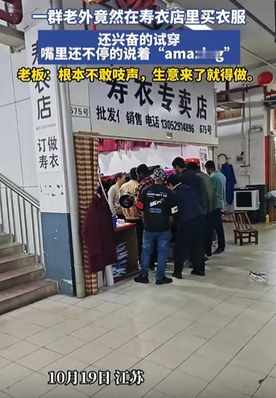 “大乌龙”10月19日江苏一女子开了家寿衣店,这天刚开门,就来了一群老外,女子一