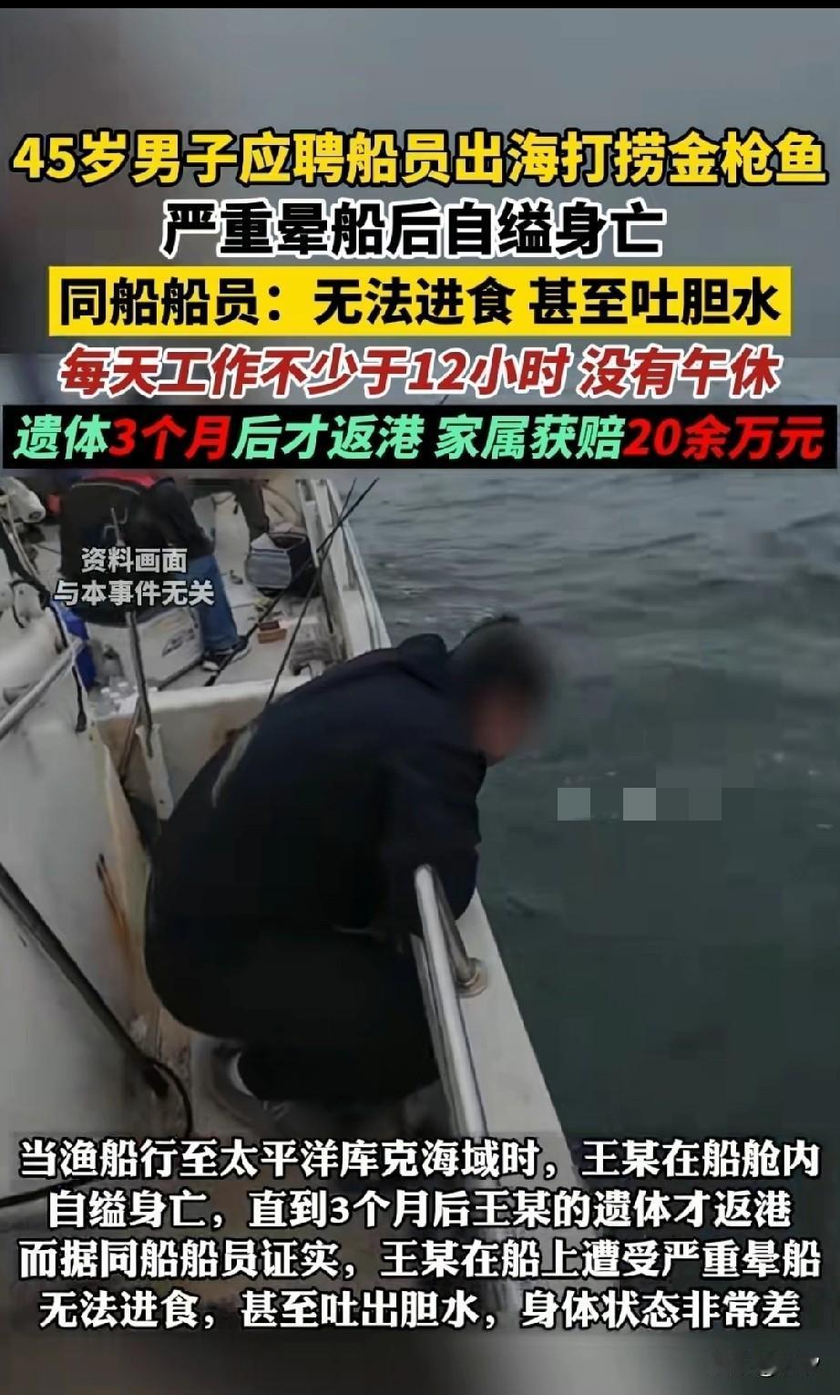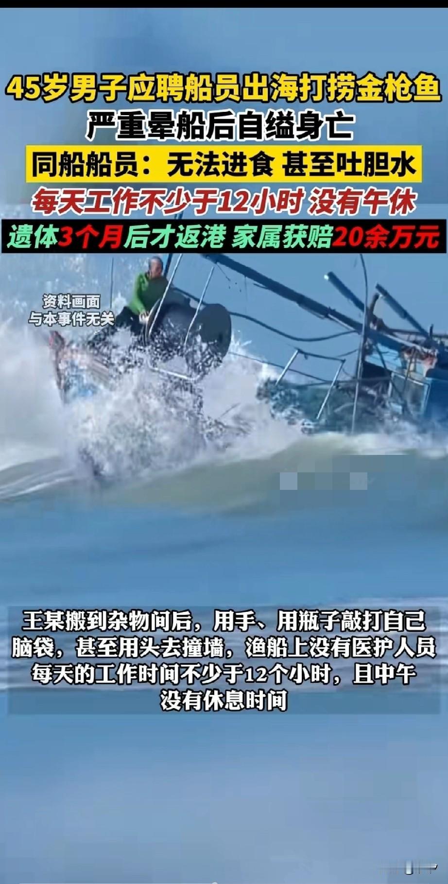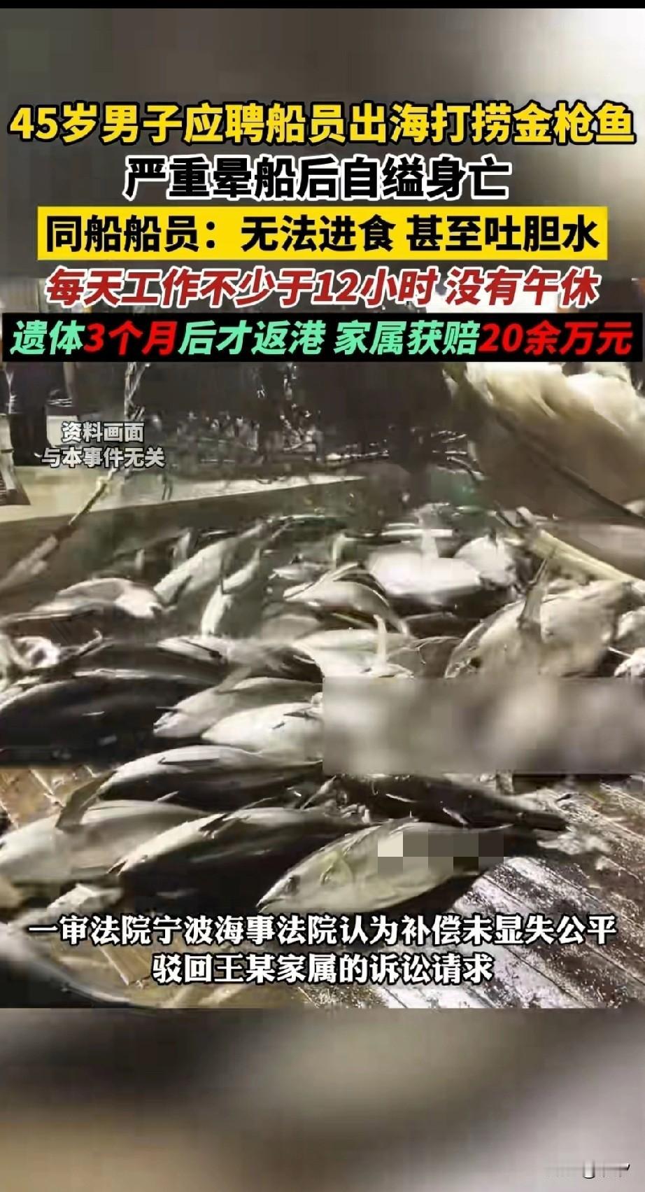 宁波这起船员身亡案让人惋惜, 遗体3个月后才返港, 家属获赔20余万元, 这简直在开玩笑, 家属上诉竟然遭遇驳回, 法院认为未明显有失公允, 一条人命只值20余万元, 这不是在开玩笑吗? 45岁的男子应聘船员出海打捞金枪鱼, 每天工作12个小时以上, 中午还没有午休, 这不是把人当机器使吗? 俘虏也不是这么使用的呀! 同船的船员表示他的身体素质很差, 上船后就晕船, 胆汁都吐出来了, 饭都吃不下去, 最后自己上吊自杀了, 听起来简直就离谱, 不过大海上确实有风险, 不过因为晕船自杀还是有些离谱, 这一年一百万的工资真不好挣, 大家对于45岁男子的工作遭遇怎么看? 宁波身边事 出海捕鱼 海员那些事 金枪鱼 船员死亡 远洋船长遇害案 宁波伤人事件