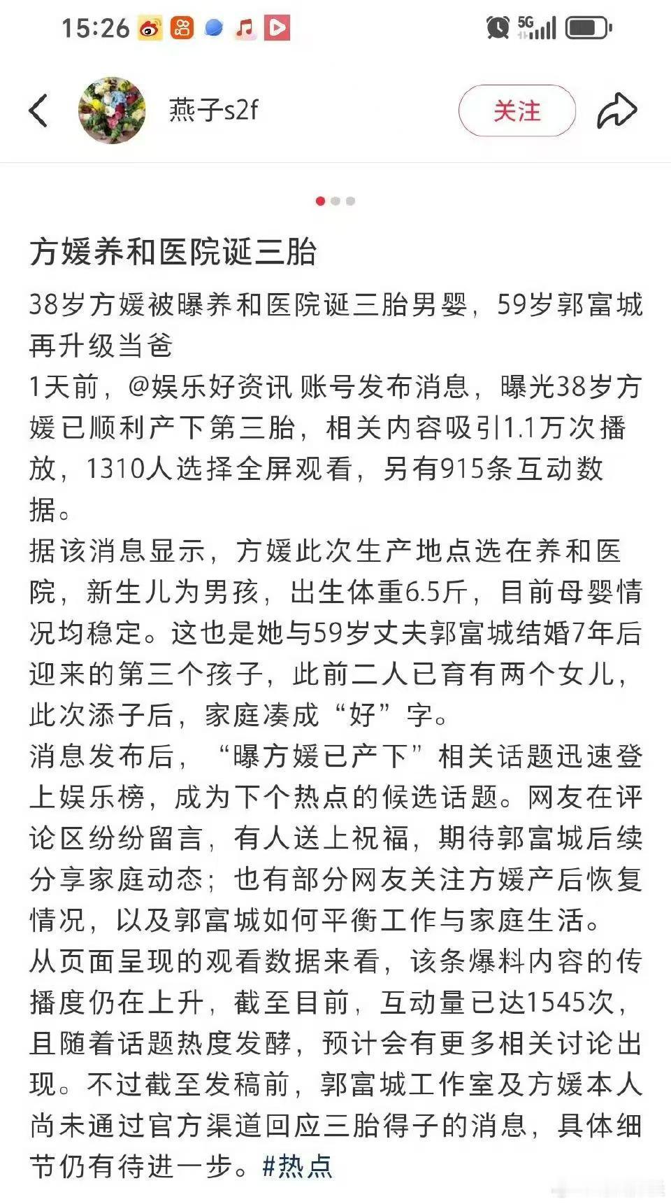 曝方媛三胎产子 有很多网友曝方媛第三胎产子和不但进了月子中心,郭富城取消了她的信用卡上限,恭喜恭喜曝方媛第三胎生的是男孩