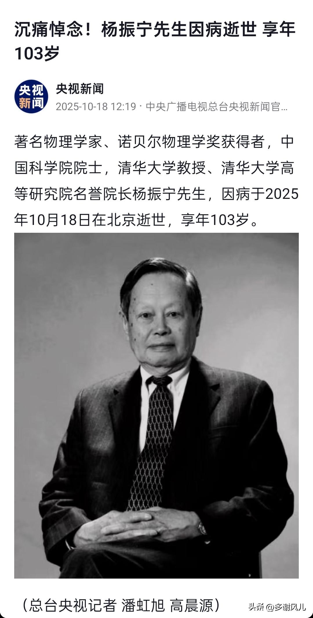 杨振宁先生走了,享年103岁! 昨天网上就爆出很多小道消息说,杨先生逝世了,但没有官方媒体正式报道,以为是谣言。今天央谋正式确认了。 杨先生这一路走来,在学术界威名赫赫,也为祖国做了很大贡献。杨先生当选2021年感动中国人物,颁奖词是这样写的:“你贡献给世界的,如此深奥,懂的人不多。你奉献给祖国的,如此纯真,我们都明白。”这份感谢词可以说是对杨先生一生的非常凝练的总结。在学术界,他提出了与爱因斯坦广义相对论相媲美的“杨-米尔斯规范场论”;有借此获得物理学诺贝尔奖的宇称不守恒定律;对数学物理和低维场论研究产生了深远影响的杨-巴克斯特方程。对祖国,开启了中外学术交流的破冰之旅,搭建中美学术桥梁,推动科教改革与人才培养,为国家科学建设献言献策,晚年回国在清华任教,极大地增强了中华民族的科学自信。 “宁拙毋巧,宁朴毋华”,这是杨先生的治学态度,同时他亦强调科学家应兼具“科学之美”与“人文之思”,这都是他留给后世的治学精神,值得后辈学习! 老先生这一生是有大贡献的,为世界留下了宝贵财富,祝老先生一路走好!