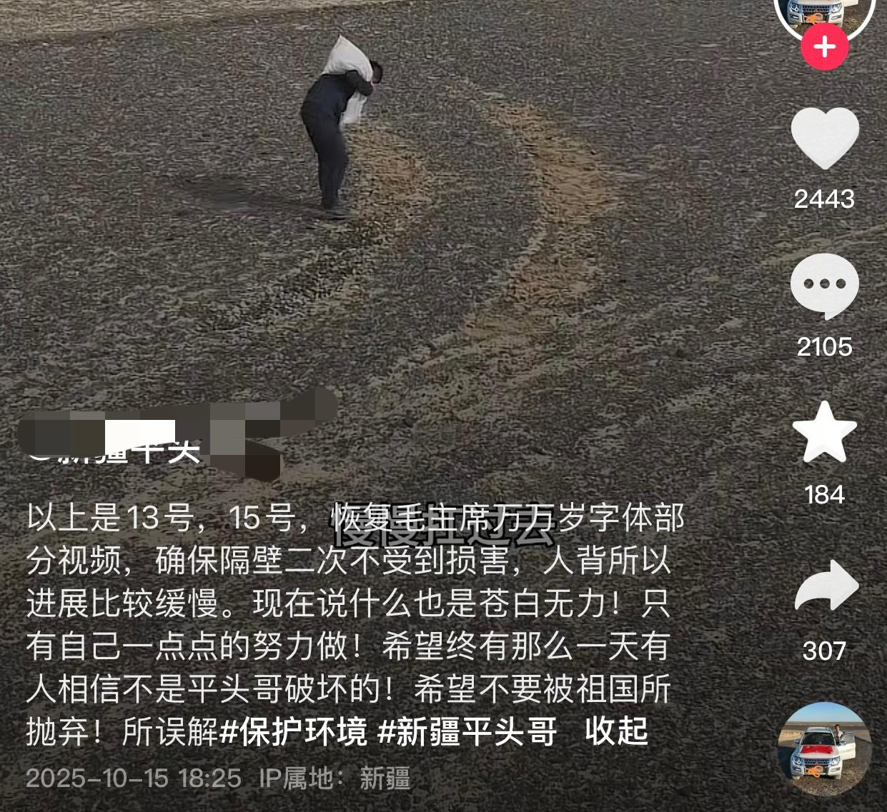 人民日报亲自发文:在戈壁滩给“人”和“民”之间添堵的越野车司机找到了…… 让人意外的是这位“平头哥”前些天还特意拍了一段修复戈壁滩的视频,又拉石子又扛袋子,还强调不是被他破坏,一副很委屈的样子,只是没想到这么快脸就被打肿,估计被处理到现在都没来得及删掉这条消息。