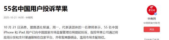 外媒:2025年10月20日,55名中国iPhone和iPad用户向中国市场监管