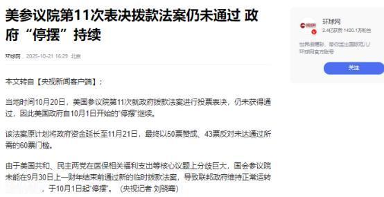 美国参议院宣布了! 10月21日,美国参议院第11次就政府拨款法案进行投票表决,结果以50票赞成、43票反对的结果仍未达到通过所需的60票门槛,这意味着美国政府自10月1日开始的“停摆”状态不得不继续维持下去。 这场持续20天的政治僵局,正把美国拖入一场荒诞的治理危机。两党在医保补贴问题上的分歧,成了这场危机的导火索。 民主党坚持延长《平价医疗法案》的强化补贴,惠及2400万美国民众;共和党则要求先通过临时拨款法案,让政府恢复运转。 双方谁也不肯先让步,更离谱的是,特朗普政府在停摆期间还忙着搞“政治报复”,冻结了民主党主政州的110亿美元基建项目,包括旧金山市滨河公园施工、纽约市给排水系统修建等民生工程。 这些项目分布在2024年没把选票投给特朗普的州,明眼人都看得出这是赤裸裸的“公报私仇”。 而停摆对美国社会的冲击已经全面显现,国家核安全管理局超过70%的雇员被迫无薪休假,仅剩下400人勉强维持运转。这个负责监管美国5000多枚核弹头的机构,如今连承包商的日常审批都停了,核武器生产进度严重滞后。 与此同时,白宫却在大兴土木,计划花费2.5亿美元新建一座能容纳999人的豪华宴会厅。特朗普声称资金来自“爱国企业”,但明眼人都知道,这种时候花纳税人的钱搞面子工程,简直是把国家危机当儿戏。 普通民众的生活更是苦不堪言,约75万名联邦雇员被迫停薪休假,4200万人依赖的关键营养援助项目将于11月到期。 航空业首当其冲,空管人员短缺导致航班延误率飙升,感恩节出行高峰可能演变成一场灾难。国家公园关闭,每天损失100万美元门票收入,周边商户跟着遭殃。更讽刺的是,国土安全部在停摆期间花1.72亿美元买了两架“湾流”G700豪华公务机,理由是“旧飞机太破”,而一线海岸警卫队员却只能用着老旧装备。 经济层面的损失同样触目惊心,政府停摆每周造成的经济损失超过150亿美元,消费者支出减少,企业投资信心下降。劳工统计局停发就业数据,美联储失去关键决策依据,只能在“浓雾中盲飞”。 高盛预测,如果停摆持续一个月,美国GDP增速可能下降0.2个百分点,4.3万人将失去工作。更严重的是,这种政治僵局正在损害美国的国际形象,投资者开始质疑这个全球最大经济体的治理能力。 面对这场危机,两党依然在互相甩锅。民主党指责共和党“拿民众利益当筹码”,共和党则批评民主党“为了政治私利牺牲国家利益”。民调显示,60%的美国人认为两党都对停摆负有责任,但双方似乎都不在乎民众的看法。众议院议长约翰逊甚至宣布,除非参议院通过拨款法案,否则众议院不会复会。这种“摆烂”态度,让美国民众彻底寒了心。 这场持续多天的停摆,暴露了美国政治制度的深层缺陷。当党争凌驾于国家利益之上,当“否决政治”成为常态,政府停摆就从偶然事件变成了“新常态”。 美国民众正在为这种政治内耗买单,而那些政客们,却还在忙着算计自己的政治利益。如果这种局面得不到改变,美国的治理危机只会越来越深,最终受伤的,还是那些普通老百姓。 来源:环球网 【美参议院第11次表决拨款法案仍未通过 政府“停摆”持续】
