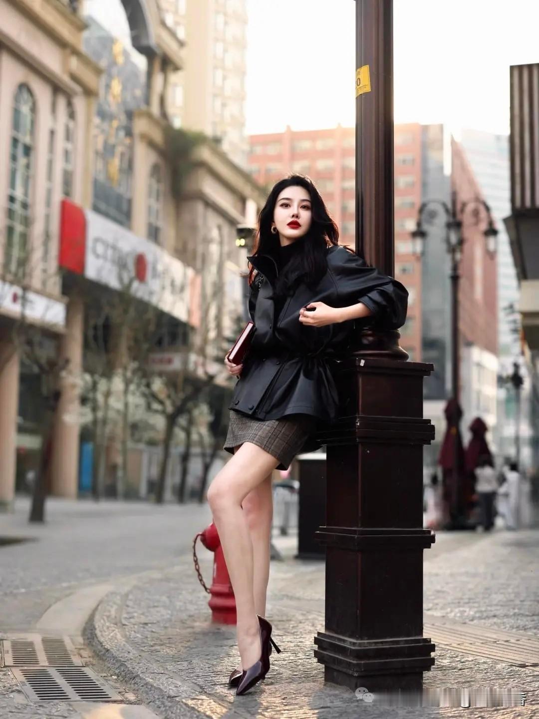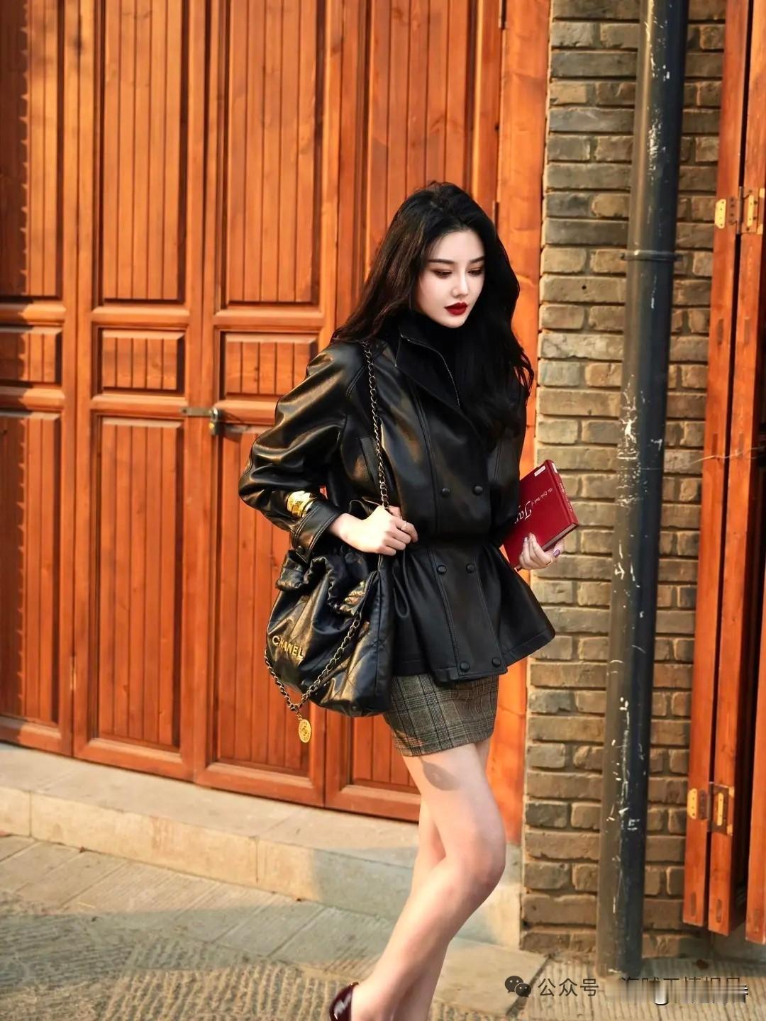 黑色皮衣下搭格子短裙,突显女神完美气质!