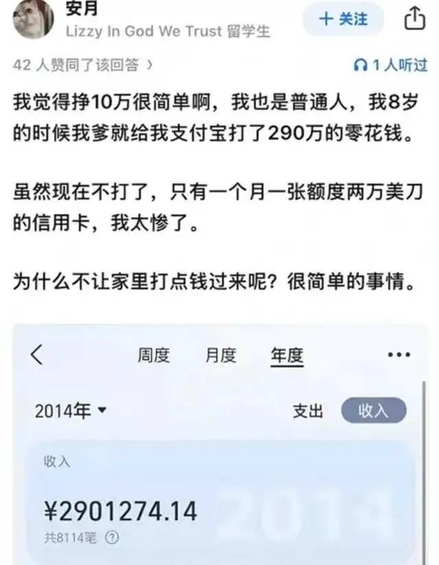 10亿家产惊爆网络!官二代留学生自曝8岁拿290万零花钱,父亲被指厅级持有外交护照。留学美国的知乎网友安月自称家产十位数,一句赚10万有那么难吗?瞬间引起关注,其父亲被曝手持多国护照,堪称世界公民。 这让人想起此前闹得沸沸扬扬的北极鲶鱼,她家九位数存款的炫耀最终被查实爷爷确实贪污。如今这位安月家的资产规模更上一层楼,不少网友直呼北极鲶鱼在这位面前根本不值一提! 虚荣炫耀的背后,是这些官二代对特权的肆意展示。一个月2万美元的信用卡额度,四十多个国家的旅行经历。这些普通人一生或许都难以企及的生活,被轻描淡写地当作日常。 更劲爆的是其父亲作为公务员却拥有多国护照的行为。一个厅级干部,哪来的十位数家产?出门在外一定要低调,不要过分显露实力。可惜,安月同学主打一个不服,反其道而行之。貌似已成功坑爹!类似的剧情不断重演,最终结果都是“让子弹飞一会儿,拭目以待”。