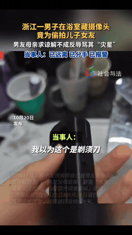 浙江,一女子在男朋友家洗澡,想拿自己的面膜时,摸到一个发热的剃须刀,她觉得很奇怪,就看了一下,结果发现是 一个摄像头,她马上意识到是未来公公偷拍她,她赶紧跟未来婆婆说,婆婆竟然笑着替丈夫辩解,女子震惊,就报了警,结果未来婆婆就骂她是灾星。 湖北姑娘跨千里到浙江男朋友家,满心盼着结婚,没成想未来公公早把偷拍设备装浴室,对着淋浴区拍了6天,被问还扯“路边捡的”。 更恶心的是,婆婆全程护短,一会儿说“一时糊涂”,一会儿拿“姑娘家名声”施压让她忍,连男友也在家人逼迫下提了分手。 别觉得“一家人”就该放松警惕,越是亲近的环境,越要多留个心眼——陌生的小物件、突然变动的摆设,都可能藏着隐患。 妥协换不来尊重,遇到这种突破底线的事,该报警就报警,千万别委屈自己。