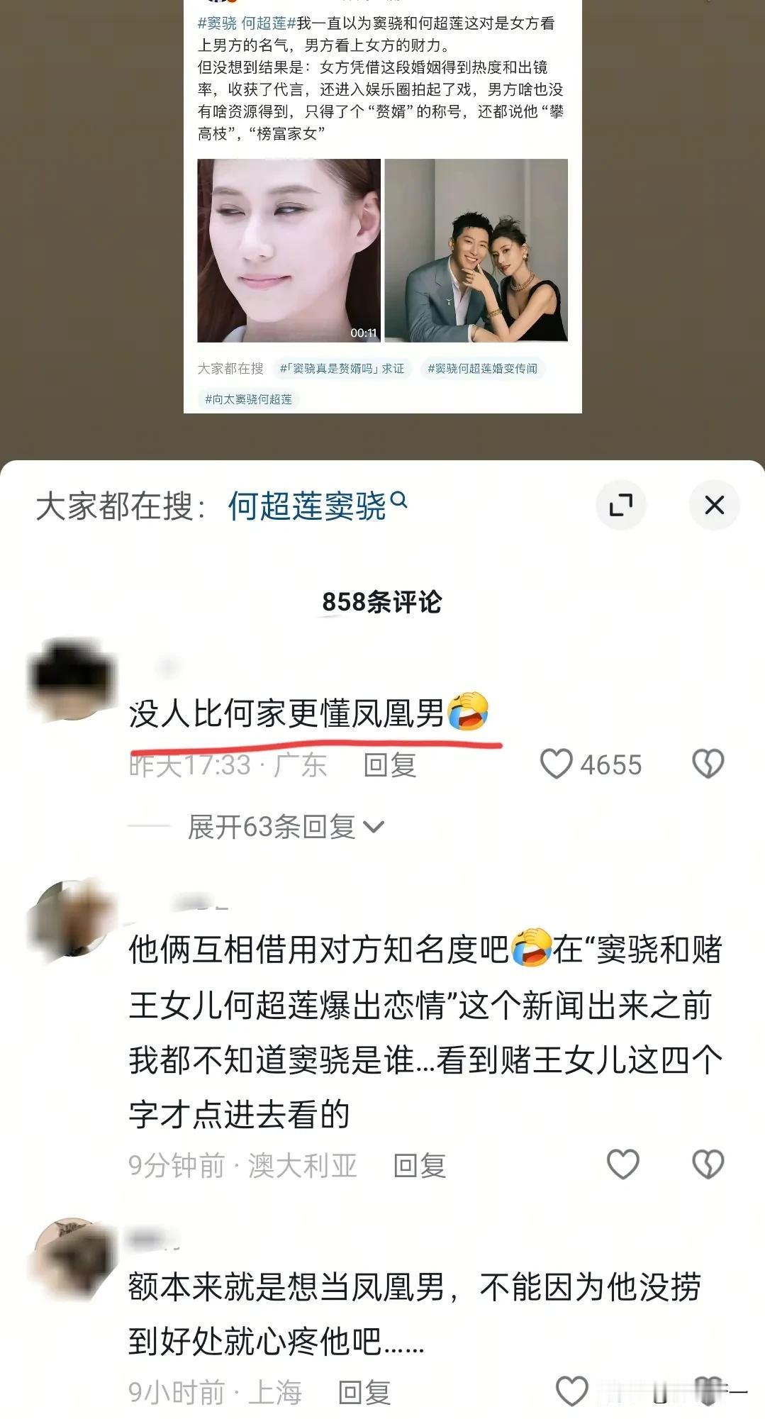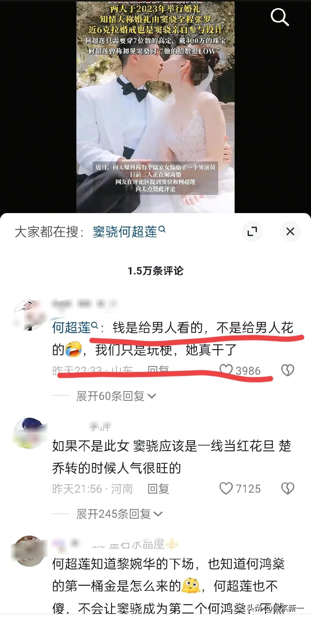 窦骁也是没招了 以为和何超莲结婚从此阶级飞升攀上豪门,结果婚变一出又是被骂凤凰男又是被骂捞男的 前一天还心疼他自己出资了6000万办婚礼 后一天网友就是人间清醒,毕竟赌王千金也不是区区几千万就能骗到的 还被网友夸赞不是恋爱脑 那一句“钱是给男人看的,不是给男人花的”也就何超莲听进去了啊[捂脸] 毕竟2019年公布恋情,当初说真心相爱,何超莲铁心嫁给他,如今也才6年半过去就传出两人婚变了,如今窦骁也是名气大跌又落得人财两空啊! 窦骁还是没有天王嫂方媛能忍啊!
