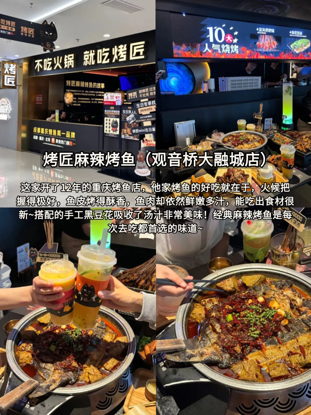 3️⃣烤匠麻辣烤鱼(观音桥大融城店):重庆烤鱼店他家数一数二的排队王!每次去都要点的经典麻辣烤鱼