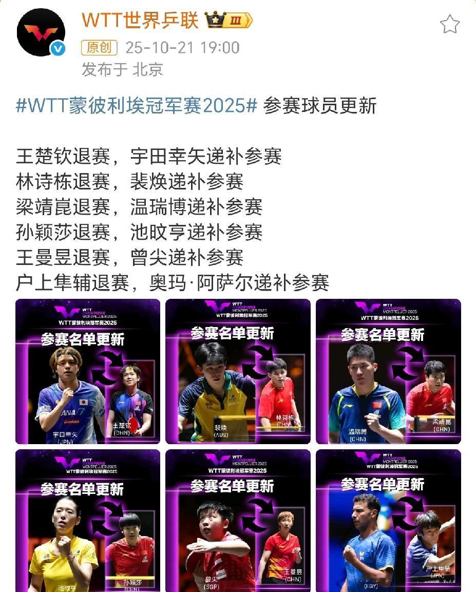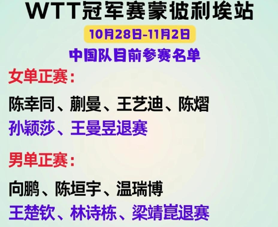 王楚钦退赛了, 孙颖莎退赛了, 王曼昱退赛了, 梁靖崑退赛了, 林诗栋退赛了。