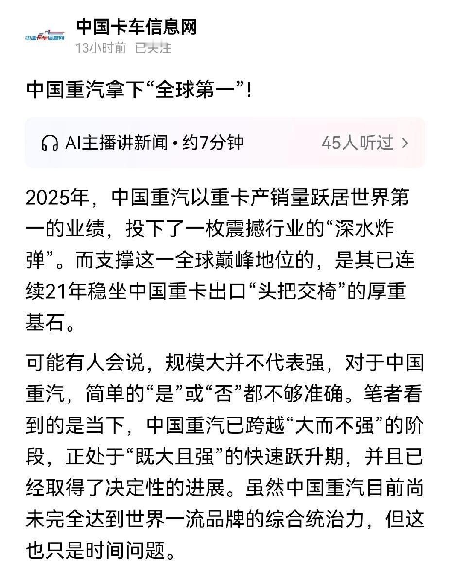 中国重汽成了世界第一卡车企业,济南也出现世界第一的企业了。 今年以来,中国重