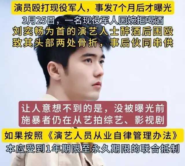 喝了一点点酒,有了一点点名气,刘奕畅就飘了,谁都不在他眼里了。 这下好了,借酒闹事,殴打军人,还抢人手机,合伙串供,这一壶有他喝的。 有些人就是这样的不知天高地厚,总以为他可以横行世上,动不动就使横,不遂意就抬手揍人。 刘奕畅本身就不是什么好鸟,要不然也不会因别人拒绝喝酒,就抡起酒瓶子把人打骨折。 做人狂妄到这个份上,还真的没救了。