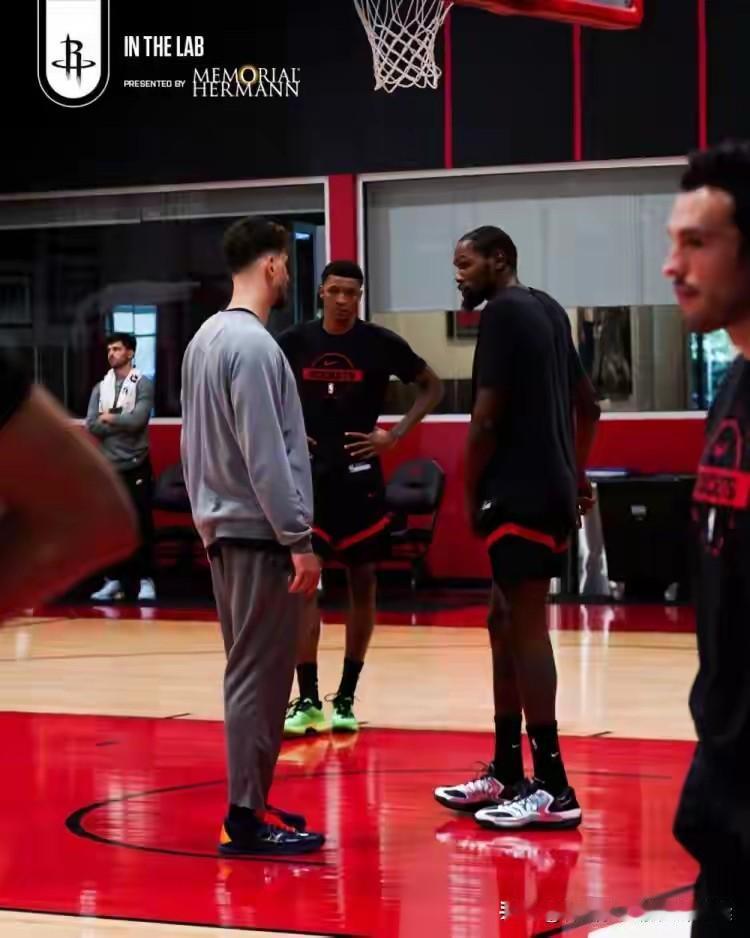 火箭晒秘密武器,三大长人一起同场秘密训话。看来对于今天战雷霆,杜兰特有话交代小弟。
