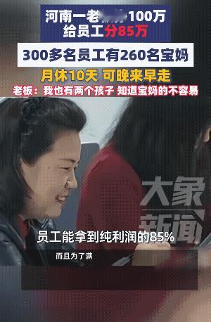 “做梦都想不到有这样的工作!”河南一老板挣100万,结果给员工分85万,万万没想到员工竟然招聘的还是“宝妈”。 很多宝妈想要找个“既能带娃接送孩子上下学还能挣钱”的工作,别谈有多难了。许多宝妈面对的求职困境,更别说高薪了。 河南郑州做冻品生意的老板王宾招的员工里,300多名员工里,有260多人是宝妈。他也是两个孩子的父亲,他知道宝妈有多不容易。所以他为宝妈们提供了工作机会。 网友热议,有网友说:“我也有工厂,我每年都会把百分之九十五的纯利润分给自己,剩下的全部利润都分给下面2000多个员工。” 还有网友说:“以后要是能把生态农业做好,我也会这样做,让农民真正能赚到钱。” 也有网友说:“我去干一个月累死累活的,老板叫休一天反回头说是我们请事假给扣一天工资,一气把老板往给炒了。” 宝妈们很不容易,既要顾家,还要工作。主要是工作也没有适合宝妈的,能有这样的良心企业和老板为宝妈妈提供就业机会,真的是令人钦佩。 愿老板生意兴隆,多给员工谋福利,感谢给宝妈提供就业机会。