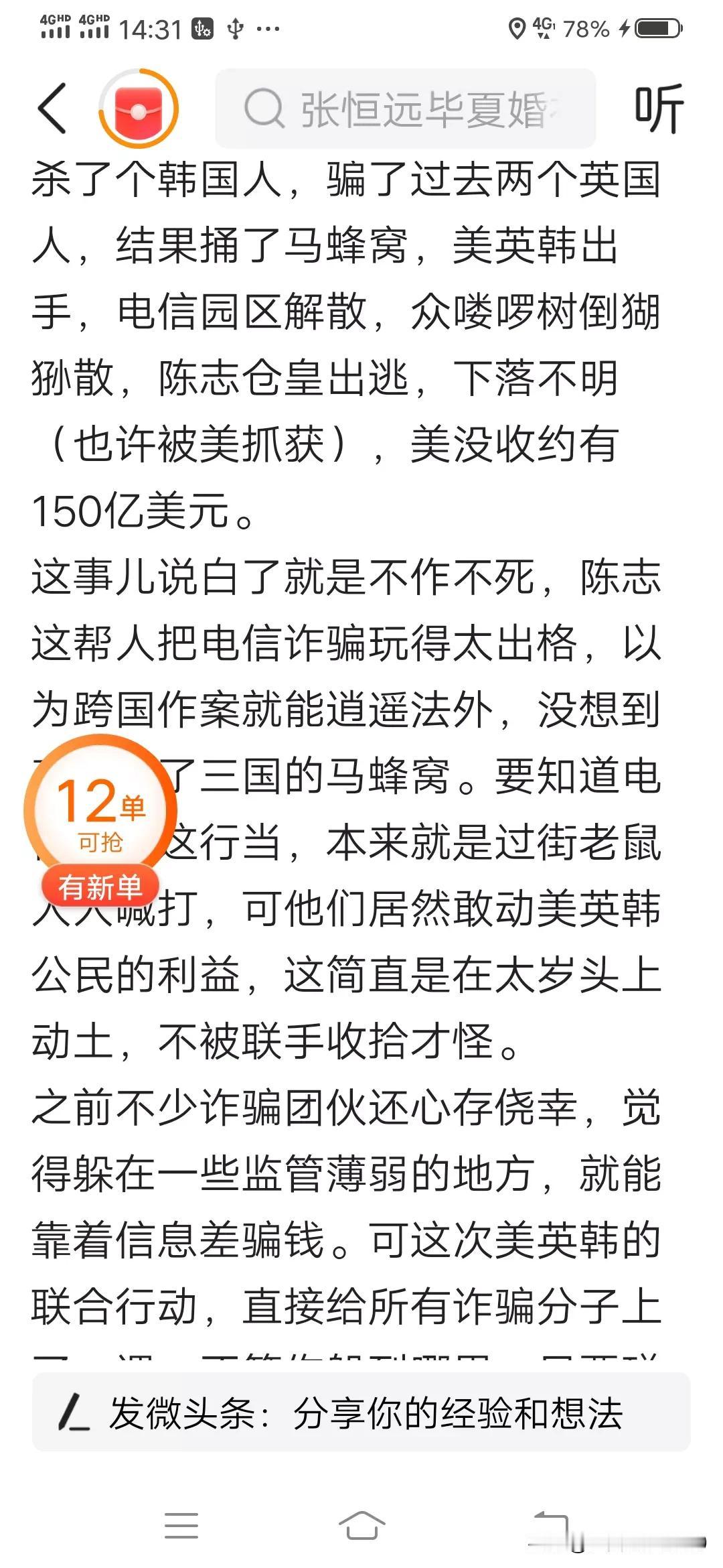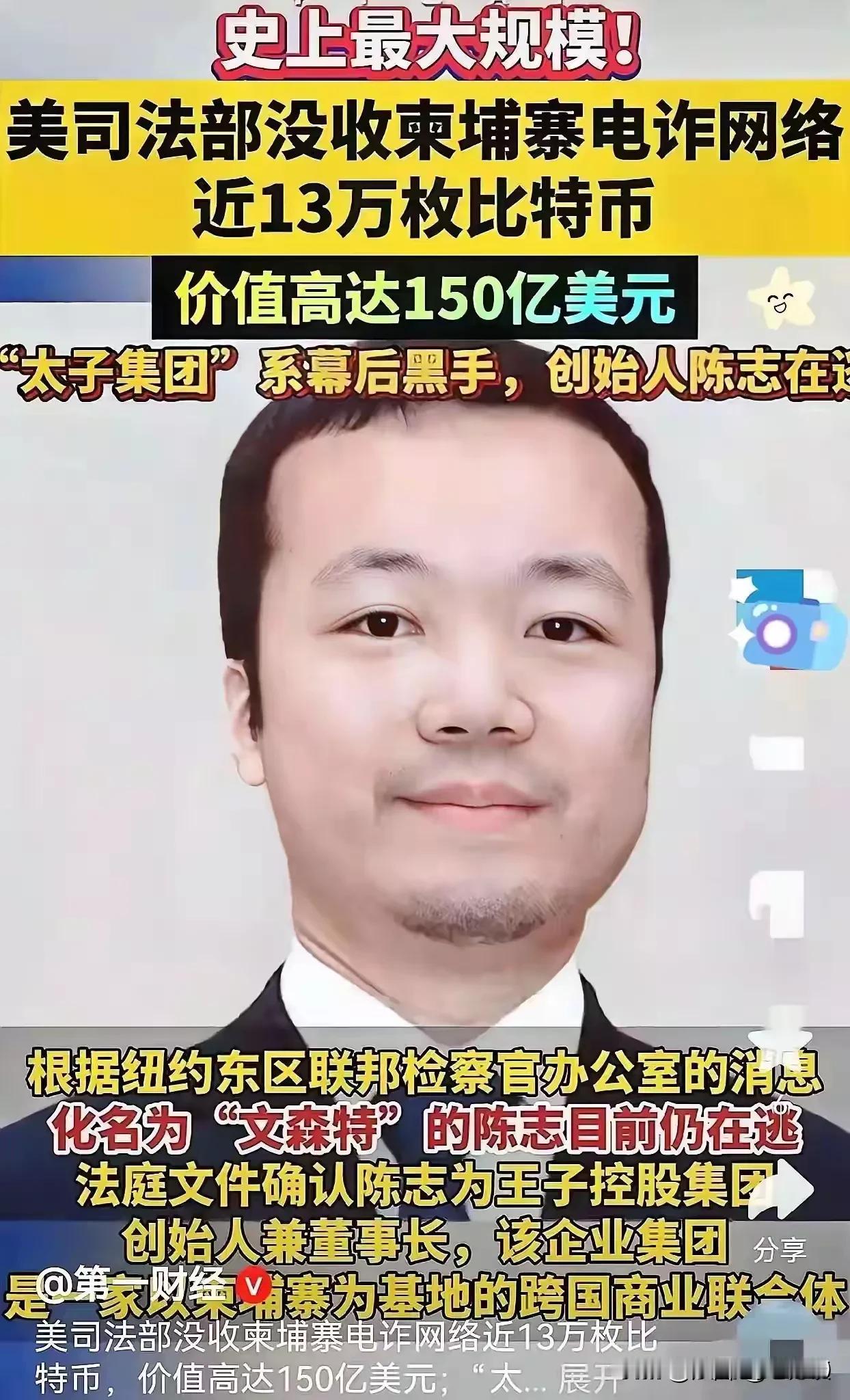 陈志诈骗团伙这回真是诈骗犯遇到了强盗,血本无归! 陈志靠电信诈骗骗了无数中国人上千亿财富,也不知道杀了多少中国人结果啥事也没有,还在国内获得2022年企业社会责任典范奖。万万没想到因为杀了一个韩国人,骗了两个英国人,竟然让美英韩三国同时出手,整个太子集团土蹦瓦解,美国没收了150亿美元的比特币,韩国冻结太子集团的960亿韩元资产,集团首脑陈志更是跑路得不知下落,可以说太子集团这个诈骗企业倒闭了,看来陈志是惹了不该惹的人,捅了马蜂窝了。