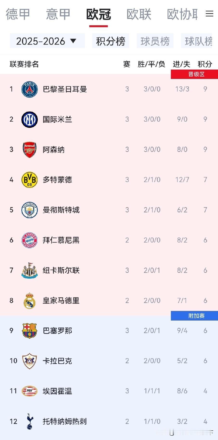 这轮欧冠是疯了吗?巴黎进7个,巴萨进6个,阿森纳、国米进4个。明天的拜仁、皇马、切尔西、利物浦再继续刷一波? 话说上赛季的欧冠四强这轮是约好的吗,最低消费4个起? 感觉今年的欧冠小组赛没有啥冷门啊,不像去年好几个豪门都去打附加赛。 我估计今年的欧冠的主线还是巴黎对抗阿森纳和拜仁的大戏。 西甲双强一个后防不稳一个中场不稳, 夺冠有点难。 意甲的国米虽然这赛季欧冠还没有经过强队检验,但也可能是个搅局者。 曼城,巴萨,拜仁,阿森纳同意吗