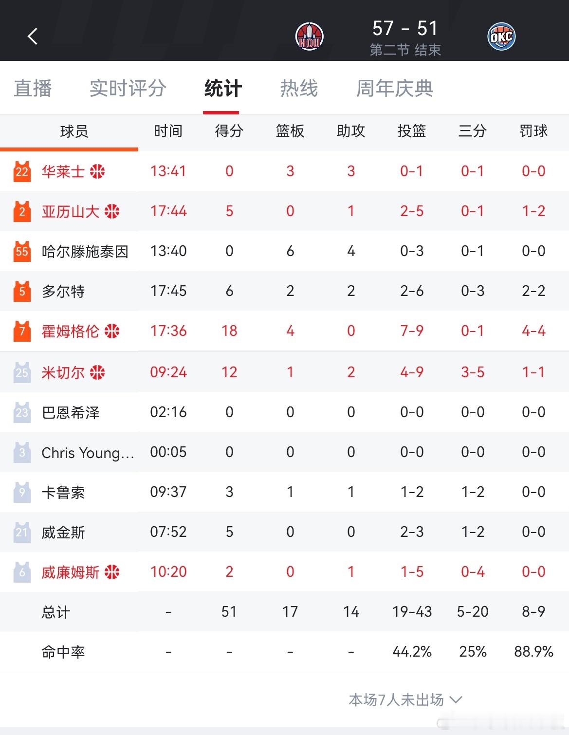 半场雷霆51-57落后火箭!