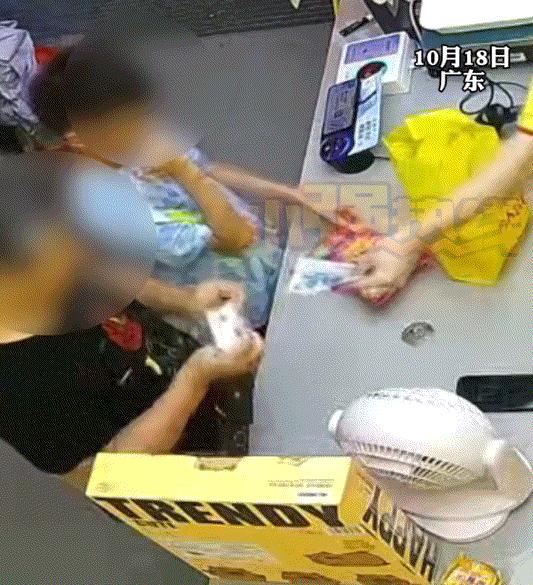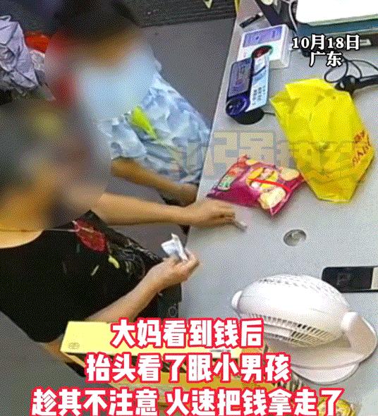 广东一超市内,一名小男孩与一位大妈同时在柜台结账。男孩将钱放在柜台上,转身去捡东