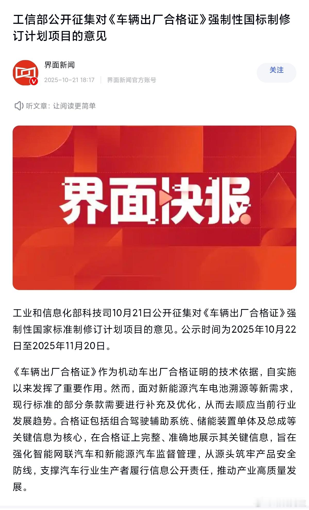 工信部公开征集对《车辆出厂合格证》强制性国标制修订计划项目的意见。