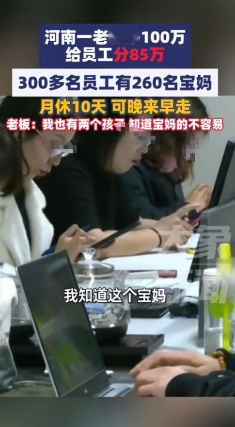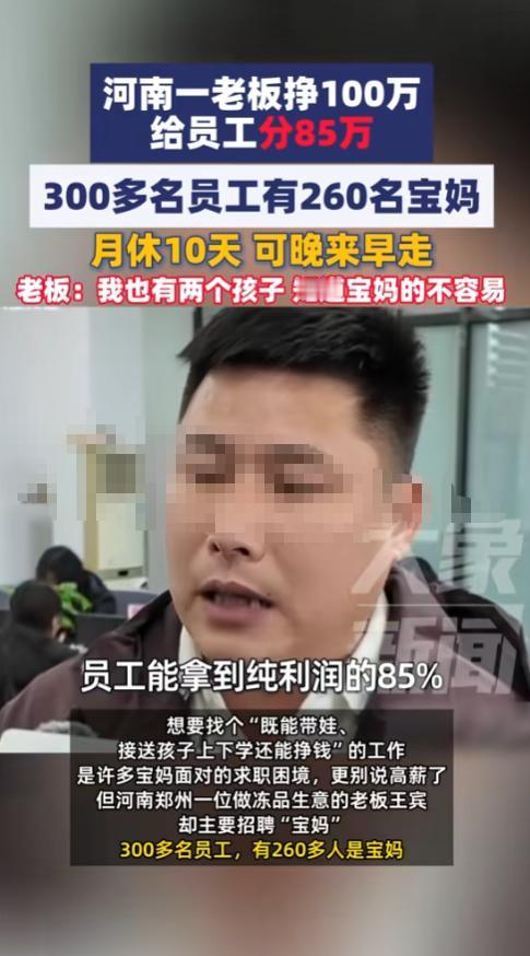 “活该他发财!”10月21日,河南郑州,一老板挣100万分给员工85万,由于公司大部分员工都是宝妈,他还实行“弹性上下班”制度,接孩子可以晚来早走,给足员工尊重,网友:这哪是老板,这分明是慈善家! 宝妈们找份工作不容易,边工作边照顾孩子时间也可能不太允许,所以很多宝妈为了专心照顾孩子做起了家庭主妇,可掌心朝上的日子可不好过。 一家冻品公司老板给员工的福利让人羡慕,月休10天可以自由调休不说,员工还能拿到公司利润的85%,也就是说公司挣100万,员工们就能分85万元。 不仅如此,这家公司还非常人性化,公司有300名员工,其中260名都是宝妈,老板自己也有两个孩子,体谅宝妈需要工作孩子两头顾,于是实行弹性上下班的制度,宝妈们如果需要接送孩子,可以晚来早走。 一些在公司里工作几个月的员工月薪已经破万,业绩好的最高甚至能拿5万元,这群宝妈表示自己做梦都想不到有这样的条件,在这家公司重新找到了自己的价值。 不少网友称老板在做慈善,其实这都是相互的,善良的老板将大部分利润分给员工,员工们一定会努力工作,除了不想辜负老板信任外,利润也直接与自己挂钩,这样下去公司只会越干越红火,老板发财是必然! 信息来源:《河南一老板挣100万给员工分85万,300多名员工有260名宝妈》大象新闻