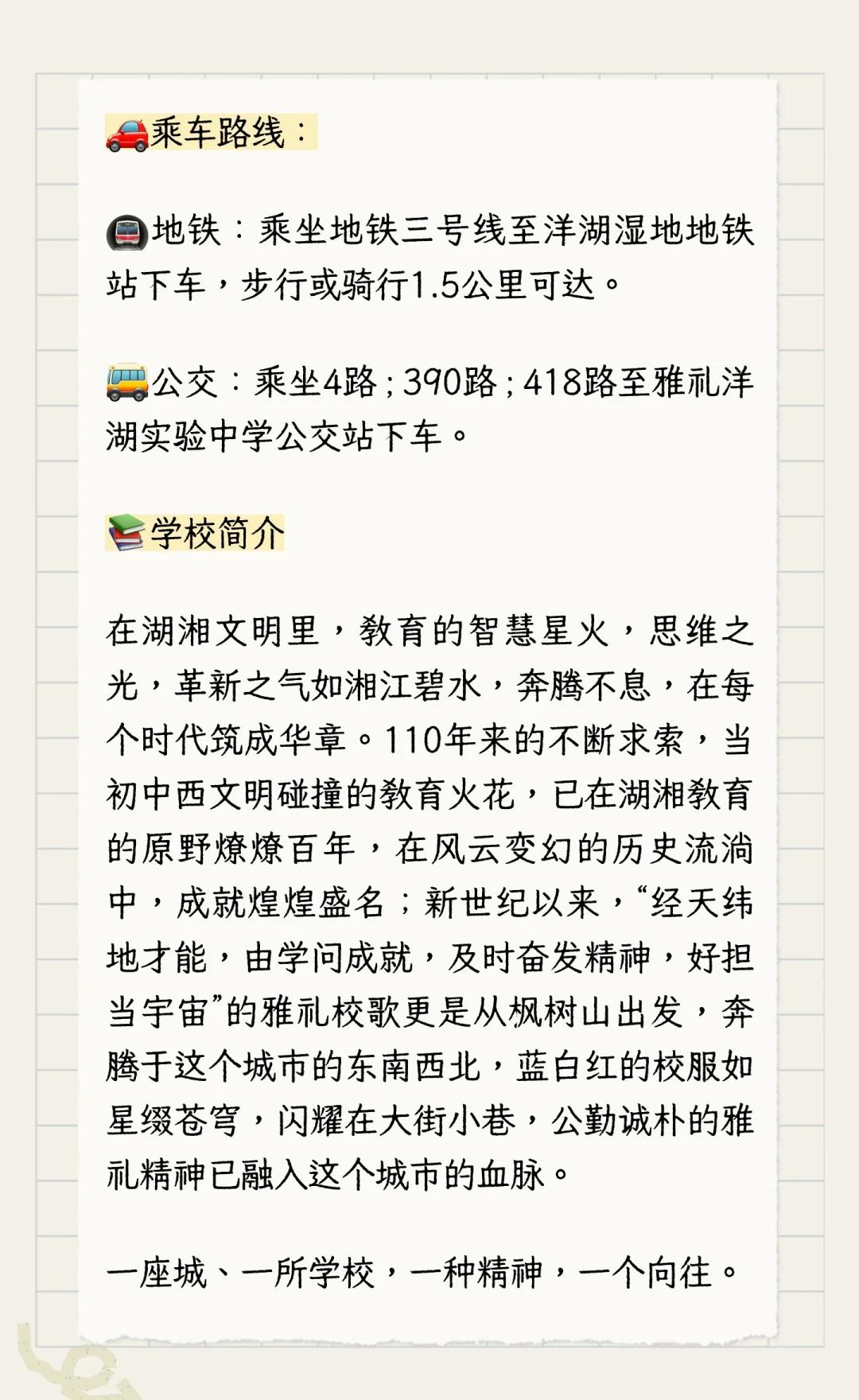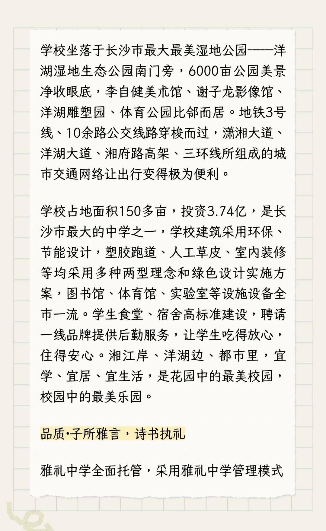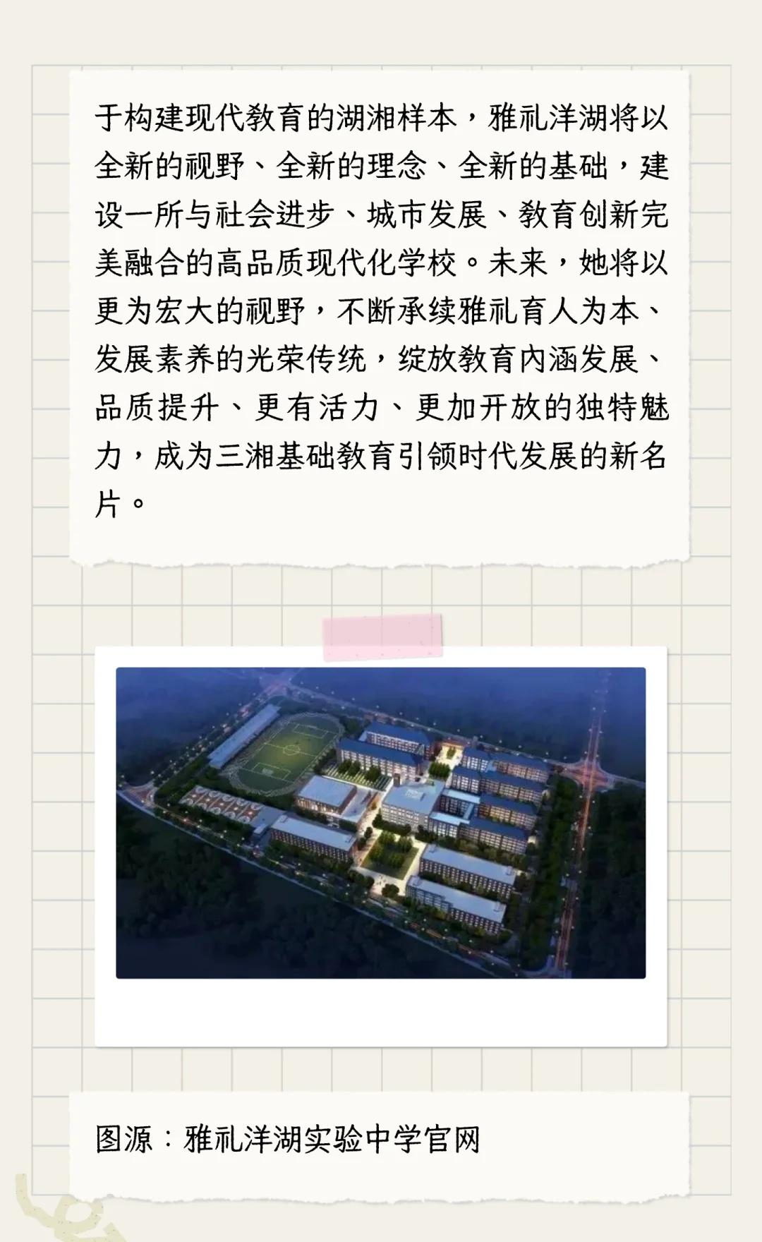 【长校】第13期!雅礼洋湖实验中学 大家好!这里是【长校】专栏,介绍长沙校园,分享学校环境、办学特色、师资力量、特色课程、学校发展和校园文化等内容,每周2更❗️ · 大家一起来看一下长沙校园介绍吧❗️ · [看]今天是【长校】第(13)期:洋湖实验中学✅ —————————————— 🏫长沙市雅礼洋湖实验中学: · ➡️学校坐落于长沙市最大最美湿地公园——洋湖湿地生态公园南门旁,6000亩公园美景净收眼底,李自健美术馆、谢子龙影像馆、洋湖雕塑园、体育公园比邻而居。地铁3号线、10余路公交线路穿梭而过,潇湘大道、洋湖大道、湘府路高架、三环线所组成的城市交通网络让出行变得极为便利。 · ➡️学校占地面积150多亩,投资3.74亿,是长沙市最大的中学之一,学校建筑采用环保、节能设计,塑胶跑道、人工草皮、室内装修等均采用多种两型理念和绿色设计实施方案,图书馆、体育馆、实验室等设施设备全市一流。学生食堂、宿舍高标准建设,聘请一线品牌提供后勤服务,让学生吃得放心,住得安心。湘江岸、洋湖边、都市里,宜学、宜居、宜生活,是花园中的最美校园,校园中的最美乐园。 · 信息 长沙初中 长沙高中 长沙中考 中学 择校 洋湖雅礼实验中学 雅礼