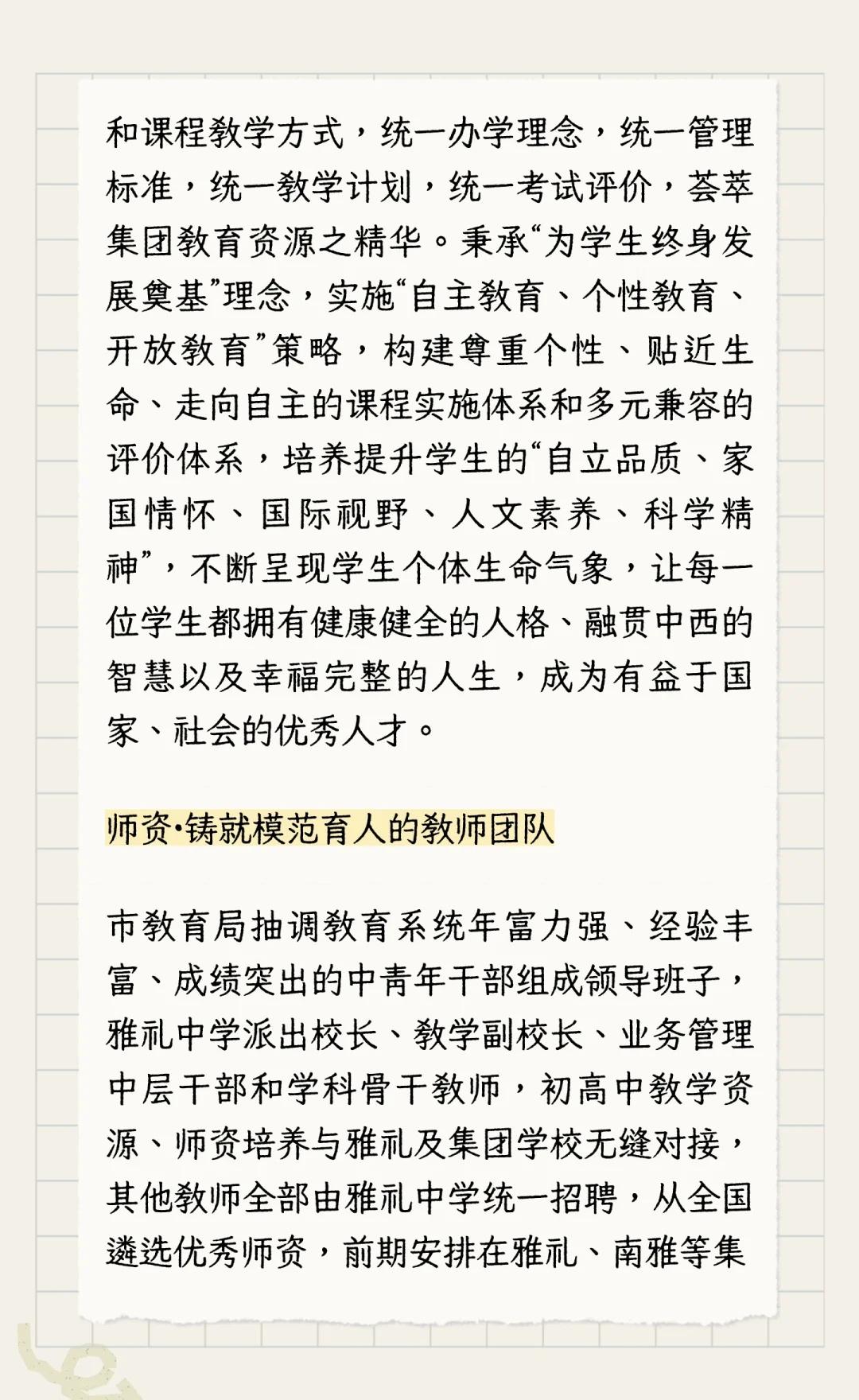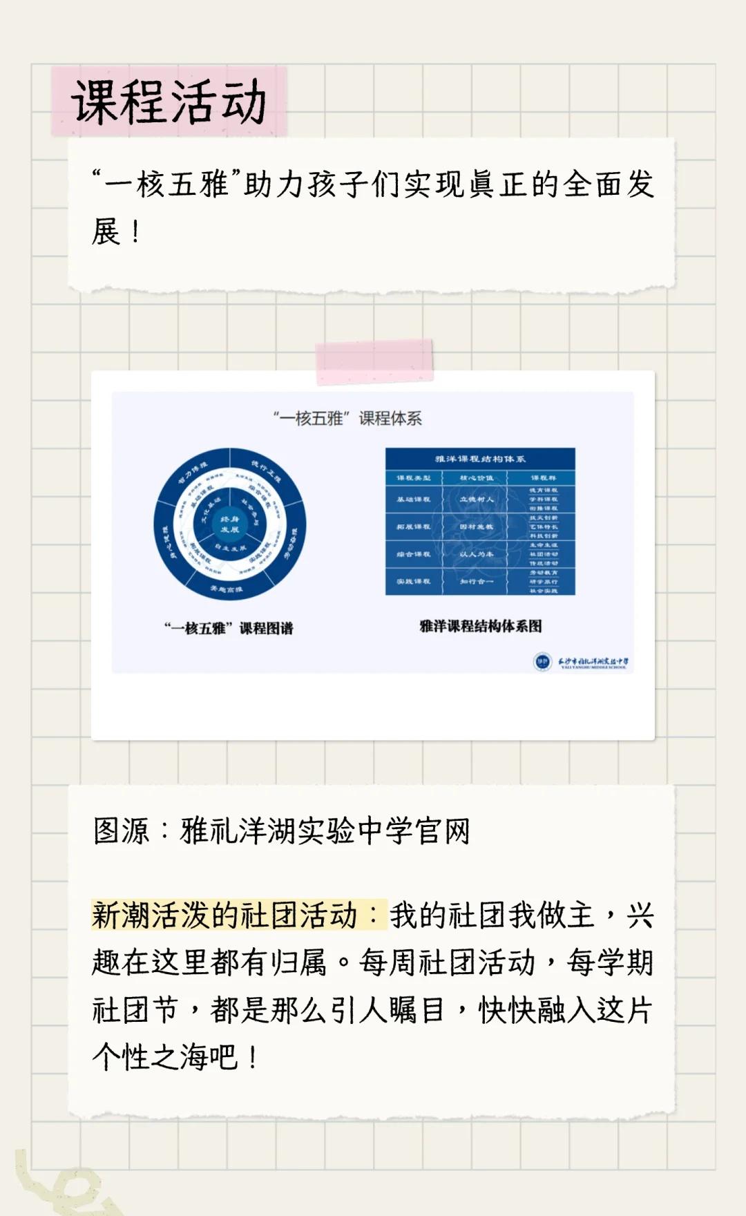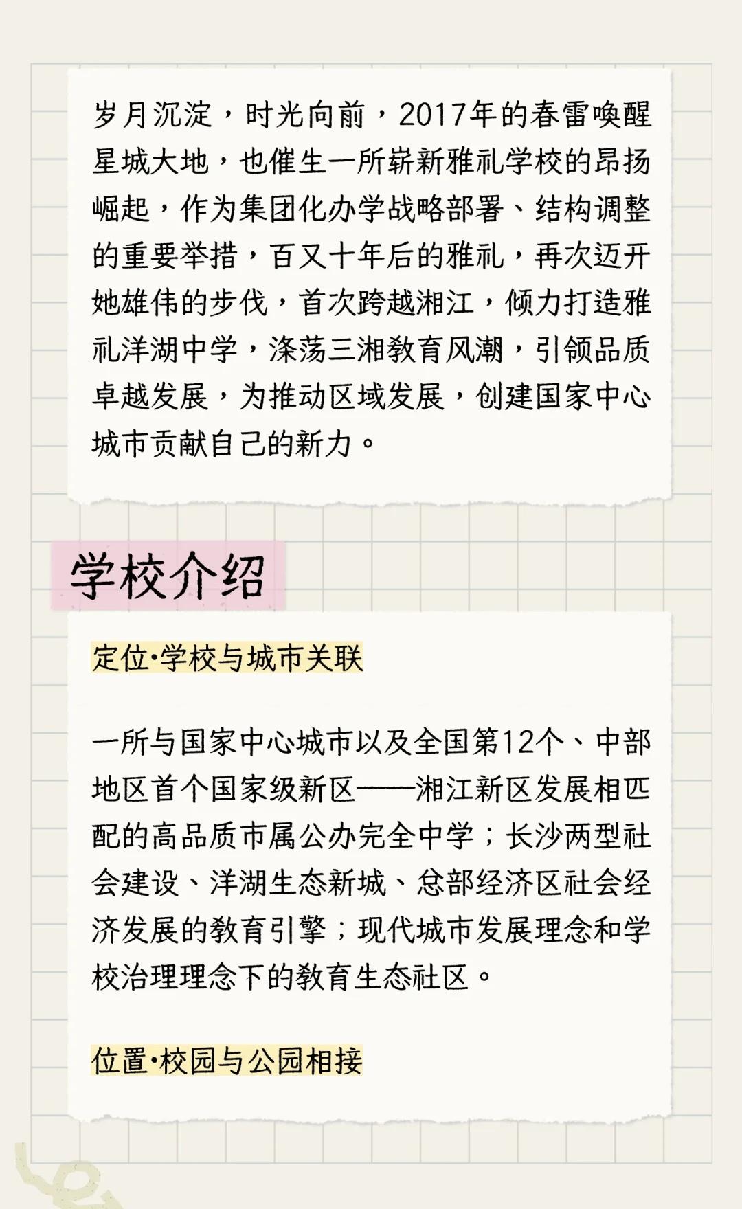 【长校】第13期!雅礼洋湖实验中学 大家好!这里是【长校】专栏,介绍长沙校园,分享学校环境、办学特色、师资力量、特色课程、学校发展和校园文化等内容,每周2更❗️ · 大家一起来看一下长沙校园介绍吧❗️ · [看]今天是【长校】第(13)期:洋湖实验中学✅ —————————————— 🏫长沙市雅礼洋湖实验中学: · ➡️学校坐落于长沙市最大最美湿地公园——洋湖湿地生态公园南门旁,6000亩公园美景净收眼底,李自健美术馆、谢子龙影像馆、洋湖雕塑园、体育公园比邻而居。地铁3号线、10余路公交线路穿梭而过,潇湘大道、洋湖大道、湘府路高架、三环线所组成的城市交通网络让出行变得极为便利。 · ➡️学校占地面积150多亩,投资3.74亿,是长沙市最大的中学之一,学校建筑采用环保、节能设计,塑胶跑道、人工草皮、室内装修等均采用多种两型理念和绿色设计实施方案,图书馆、体育馆、实验室等设施设备全市一流。学生食堂、宿舍高标准建设,聘请一线品牌提供后勤服务,让学生吃得放心,住得安心。湘江岸、洋湖边、都市里,宜学、宜居、宜生活,是花园中的最美校园,校园中的最美乐园。 · 信息 长沙初中 长沙高中 长沙中考 中学 择校 洋湖雅礼实验中学 雅礼